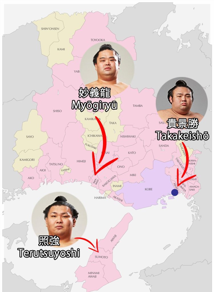 Oggi vorrei introdurvi ad alcuni lottatori a cui tengo molto. Il motivo? La provenienza. Oggi vi parlo dei lottatori originari della prefettura di 兵庫 Hyōgo, la regione in cui anche io risiedo.