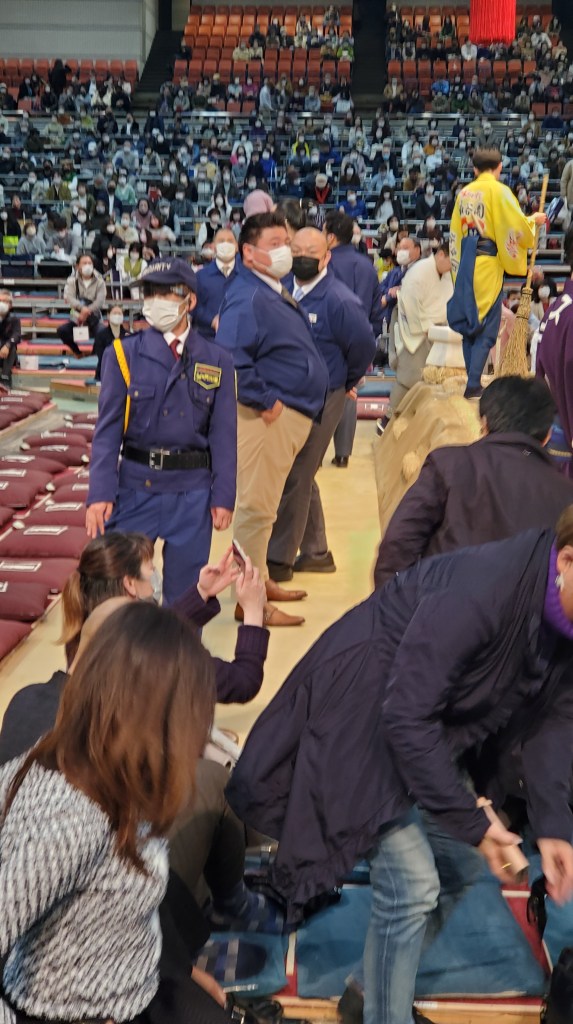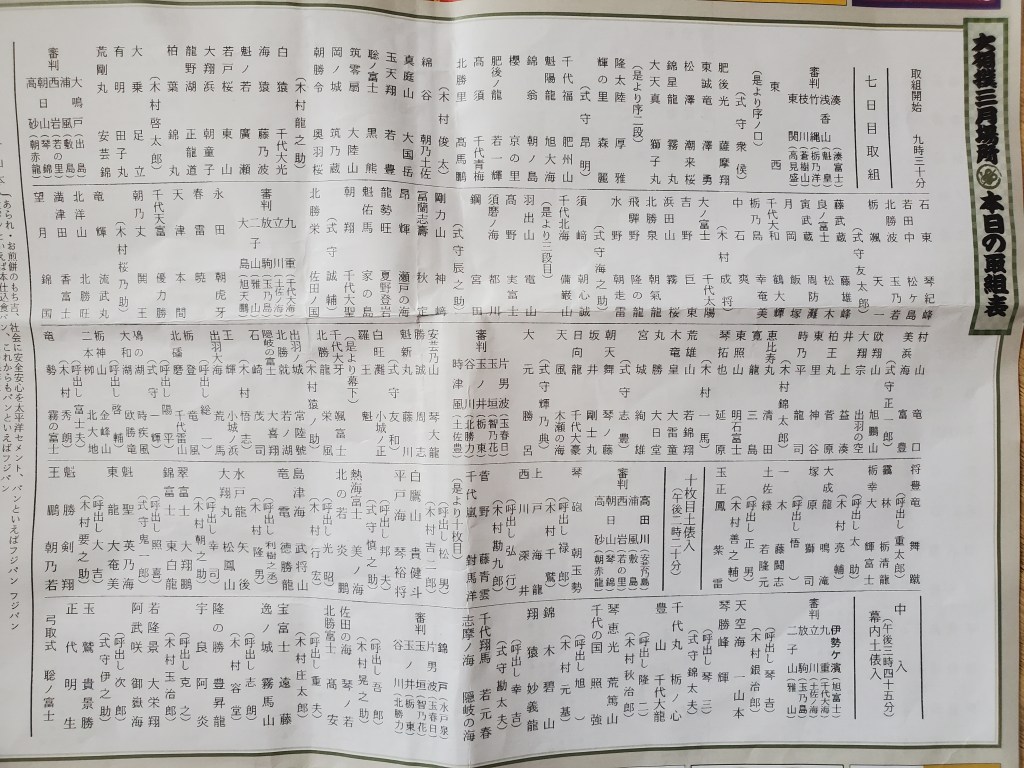 Ho mostrato il biglietto e all’entrata mi sono stati dati dei fogli tra cui uno super dettagliato con tutti gli incontri della giornata (da Jonokuchi a Makuuchi) e anche tutti i nomi e turni dei gyoji (arbitri), yobidashi e shinpan (giudici).