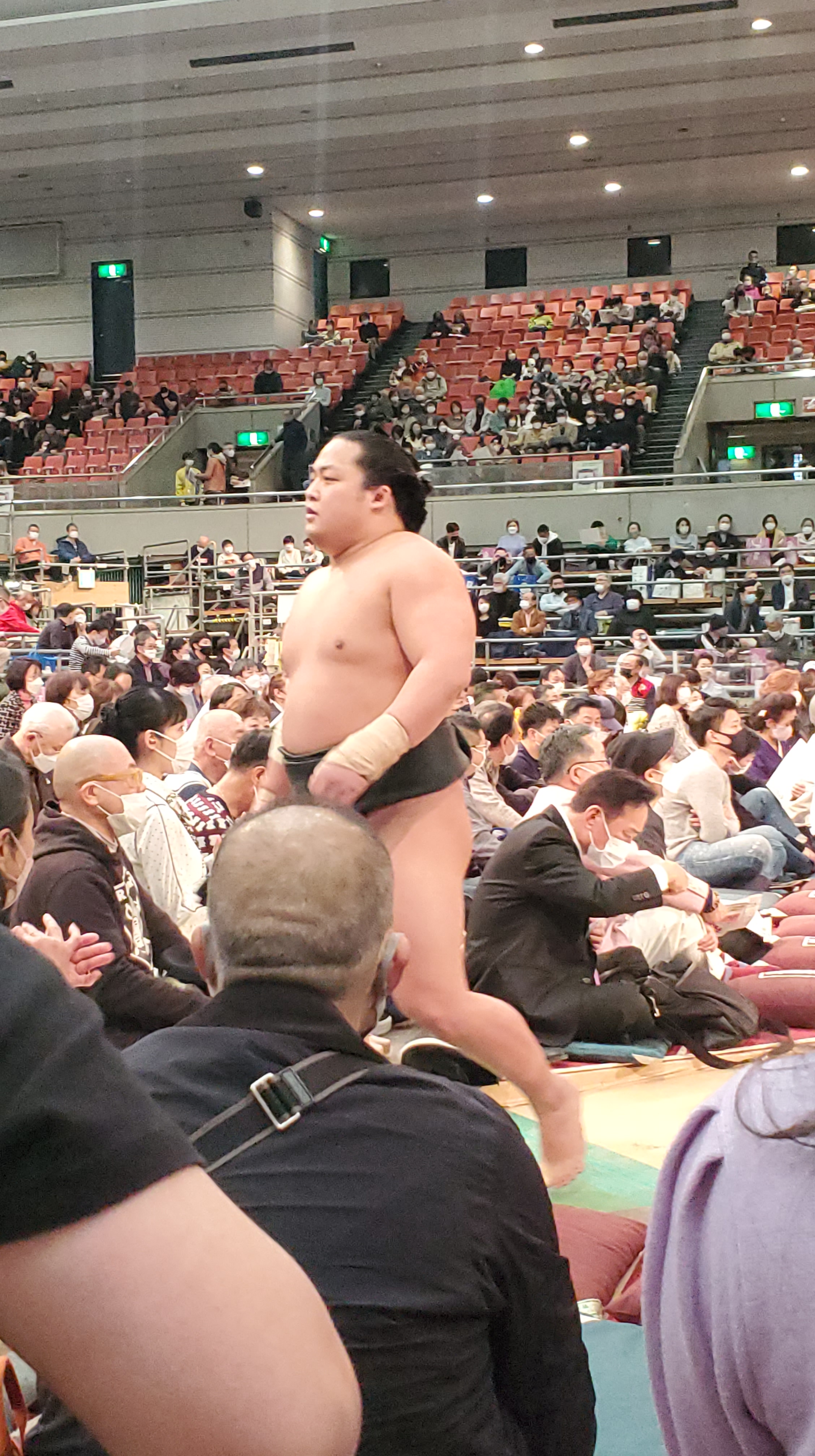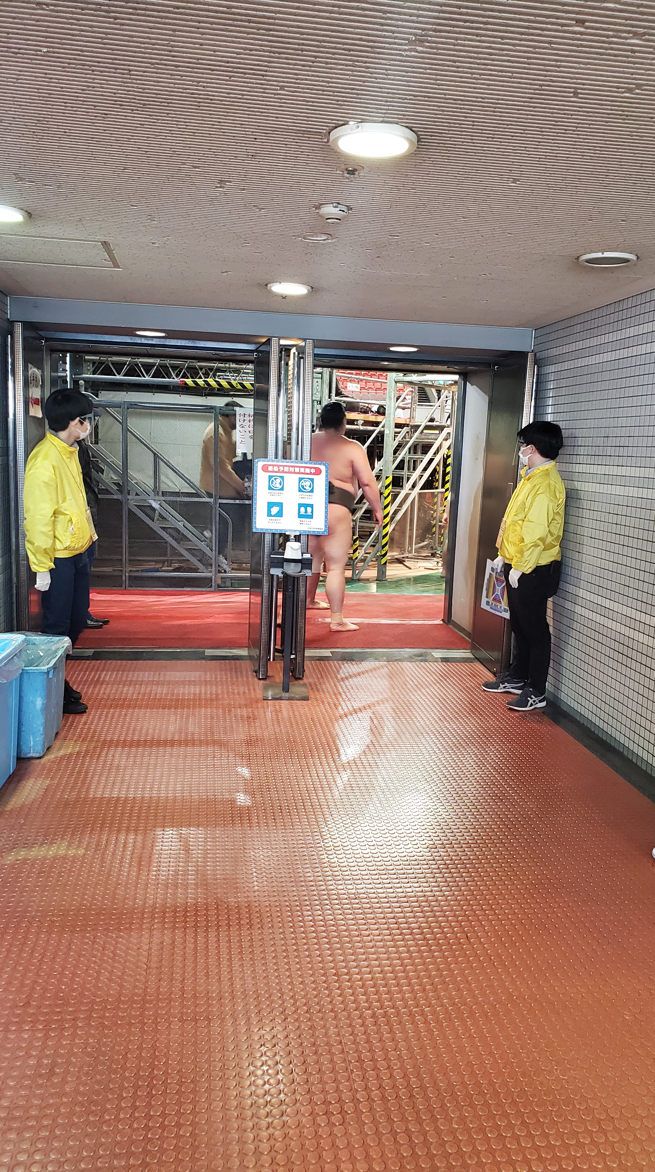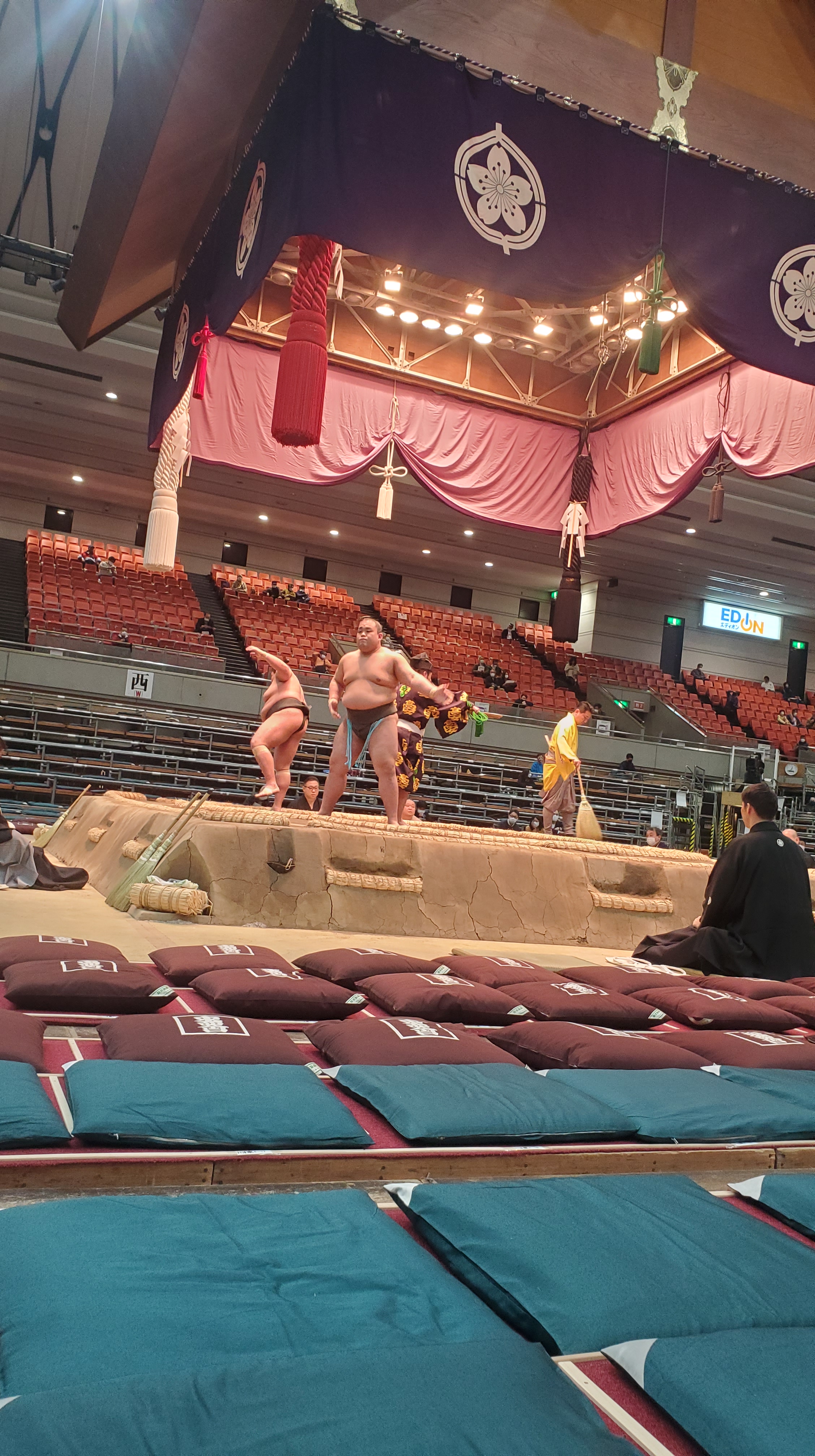Avendo un biglietto per i posti a lato ring, sul pavimento, mi sono messo a cercare l’entrata al piano terra per poi scoprire che alla Edion Arena il ring è al primo piano! Mi faccio spiegare per benino e arrivo in un posto fantastico: davanti a me la 東方仕度部屋 Shitaku-beya Est (la stanza in cui i lottatori si cambiano e aspettano il loro turno) e il corridoio che i lottatori percorrono per andare all’incontro; alla mia destra il vero “dietro le quinte” in cui i lottatori fanno stretching e si concentrano; dietro l’entrata per i tamari-seki che, per mia grande sorpresa, è la stessa che i lottatori usano per raggiungere il dohyō! Ciò significa che per entrare e uscire dall’arena (per andare in bagno, ecc…) ci si scontra sempre coi rikishi, gyōji e yobidashi. Questo è vero per le categorie basse ma anche per il Makuuchi.
