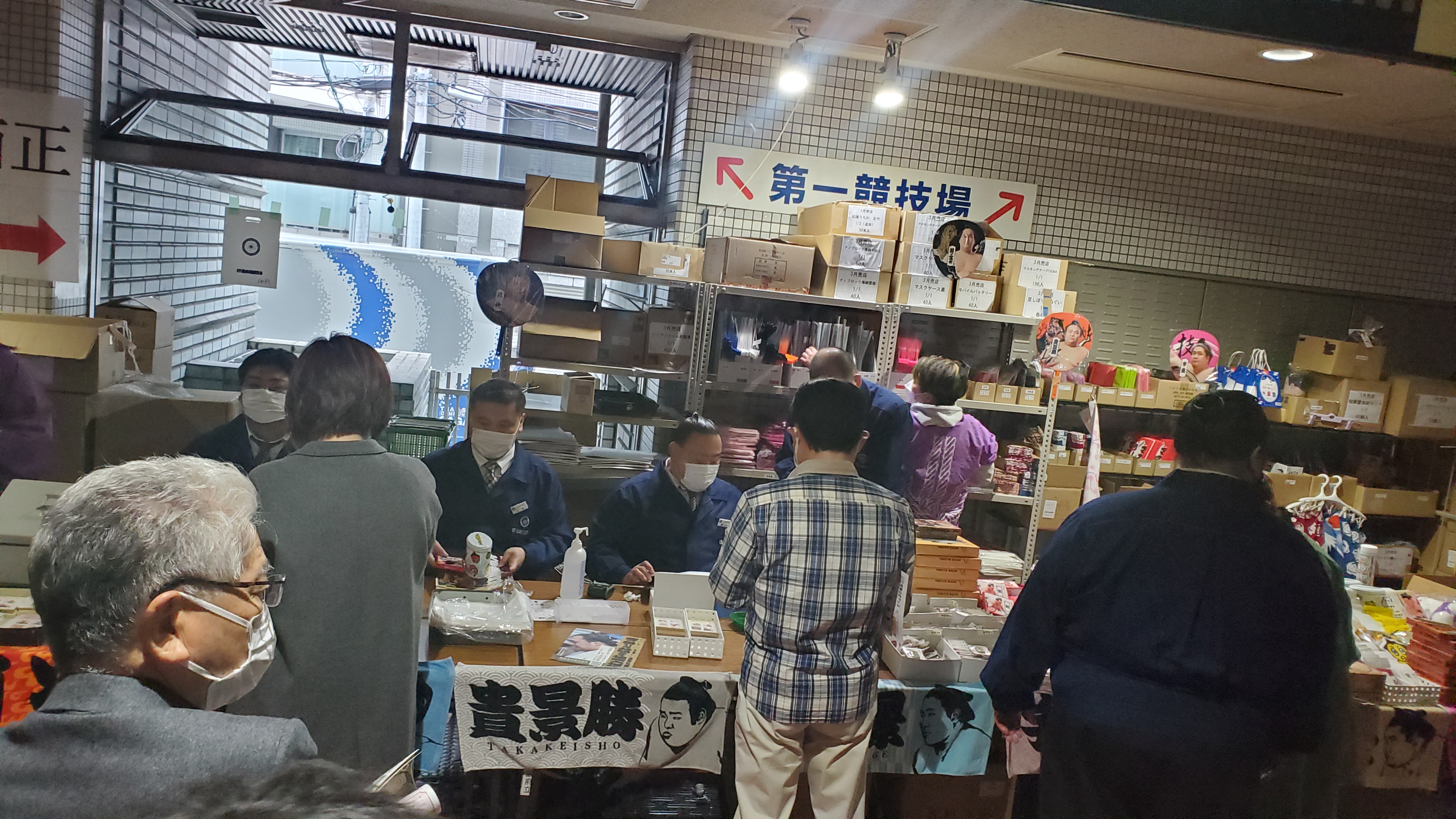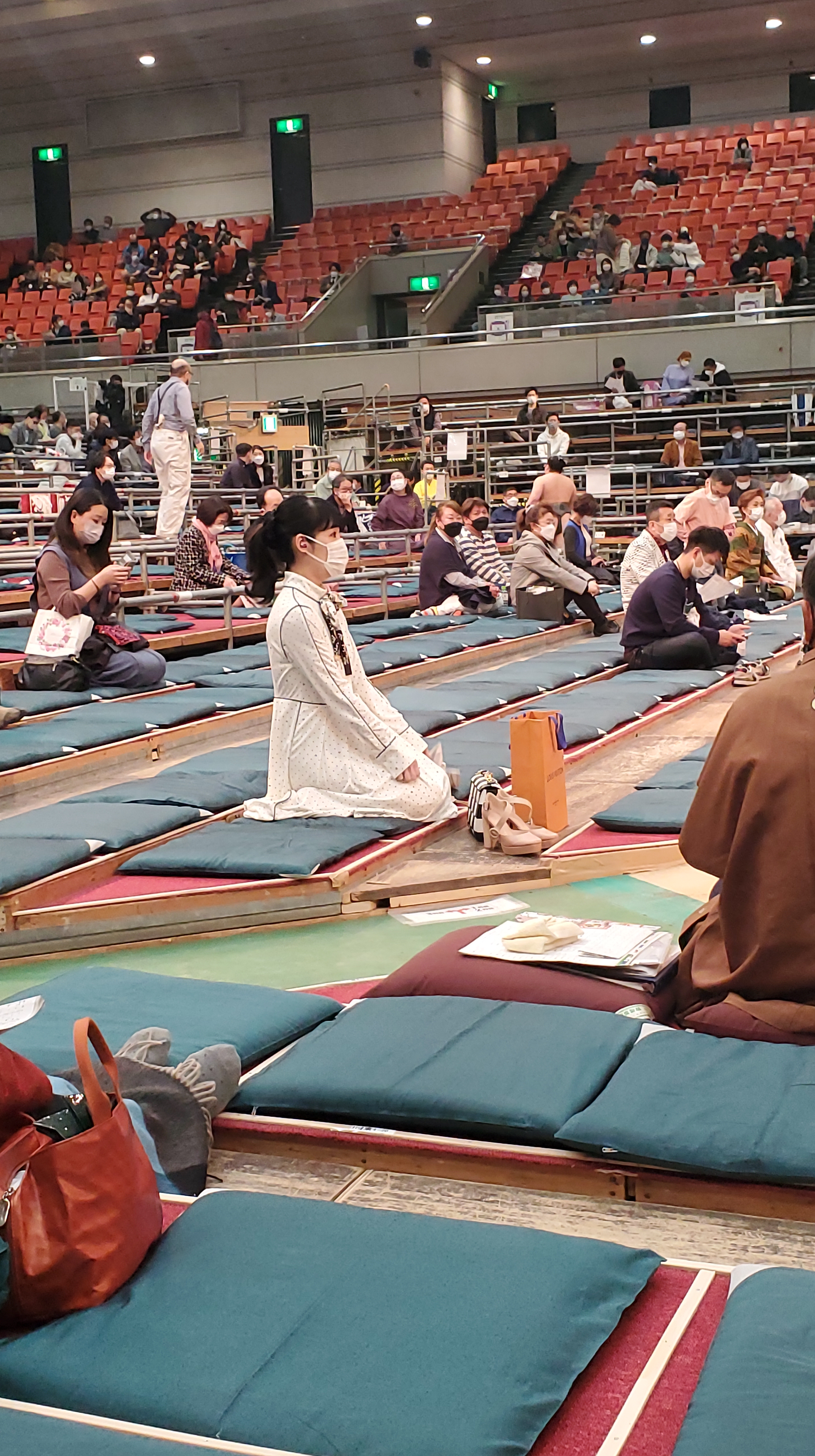 Il 13 febbraio alle 10.00 ero già collegato da un pezzo a questo link, il sito dove cominciavano le prevendite dei biglietti. Idee chiare, mouse veloce, mi sono accaparrato un biglietto in タマリ席 tamari-seki per il 19 marzo in arena. Per curiosità mi sono collegato mezz’ora dopo e, come pensavo, i posti belli erano già tutti sold out (nel weekend). Questi sono i posti più esclusivi dell’arena, i più costosi (20.000 yen, circa 150 euro) e più rari poiché la maggior parte sono riservati a VIP e sponsor. Io sono riuscito ad ottenere la settima fila (dal dohyō!). La particolarità del tamari-seki è che si è seduti sul pavimento, a bordo ring, e l’unica comodità è un cuscino striminzito su cui ci si siede togliendosi le scarpe (riponendole di fronte a sé). Come avrete intuito i posti più esclusivi sono anche i più scomodi, ma per vedere i lottatori da vicino questo e altro!