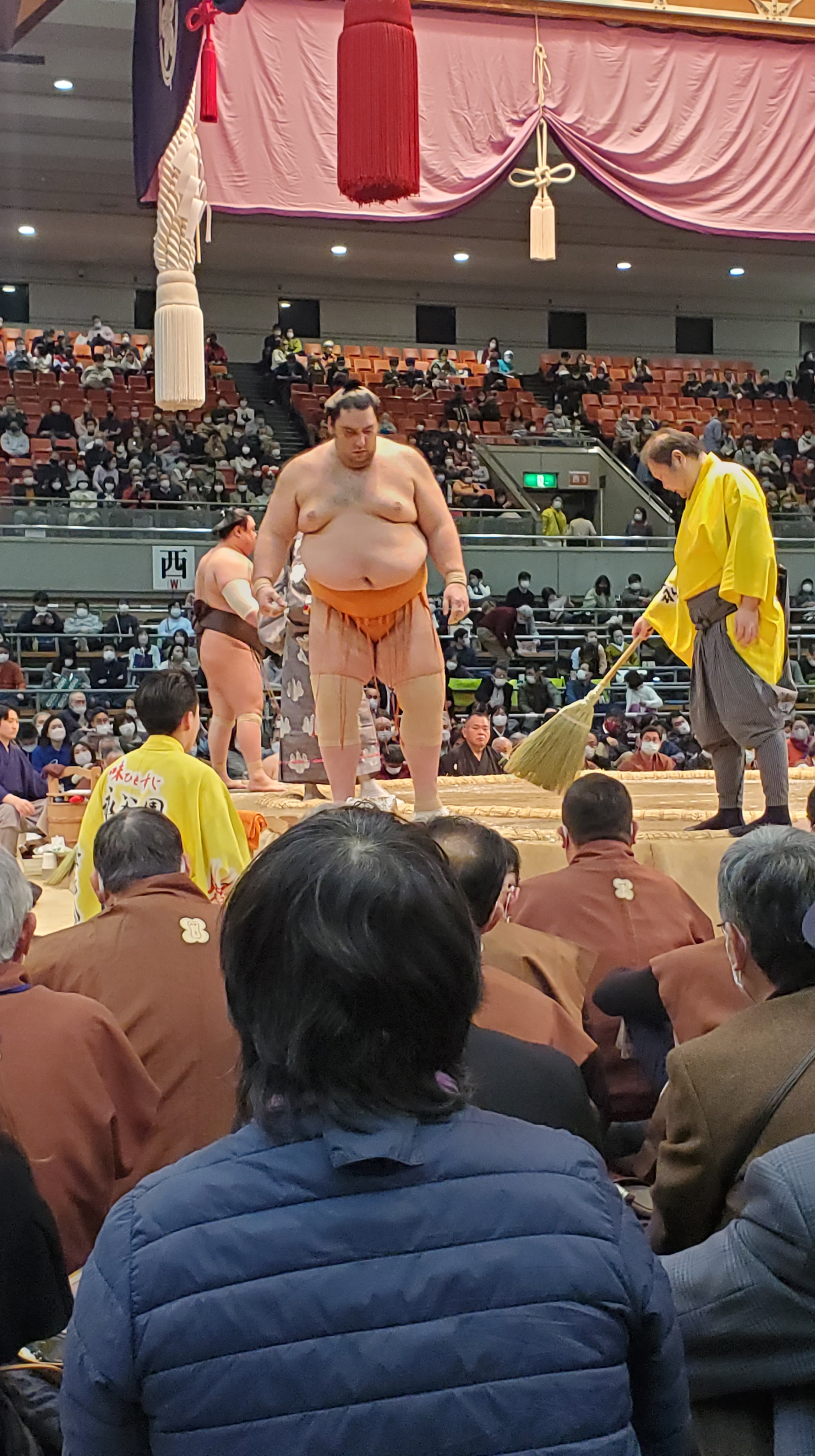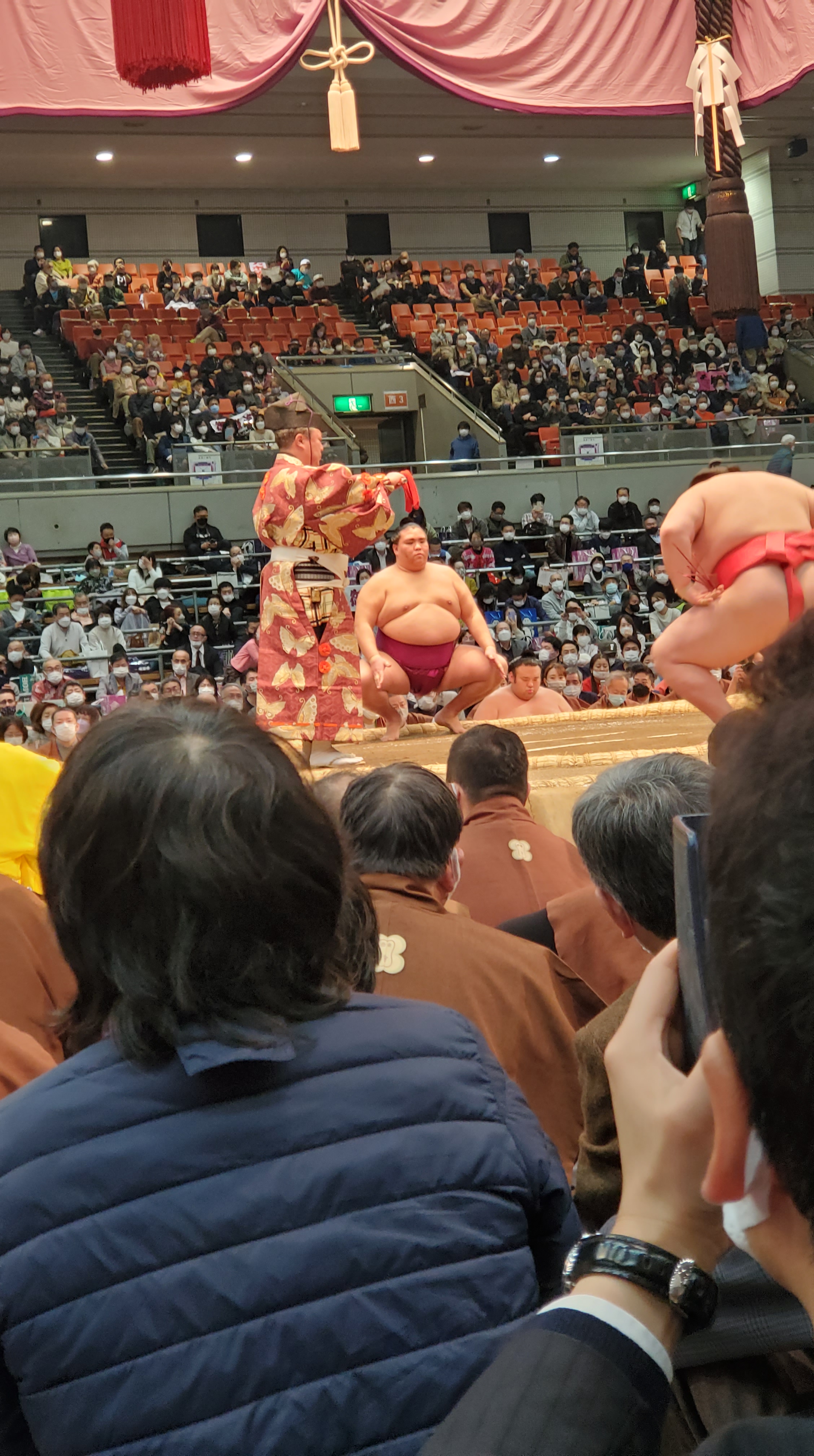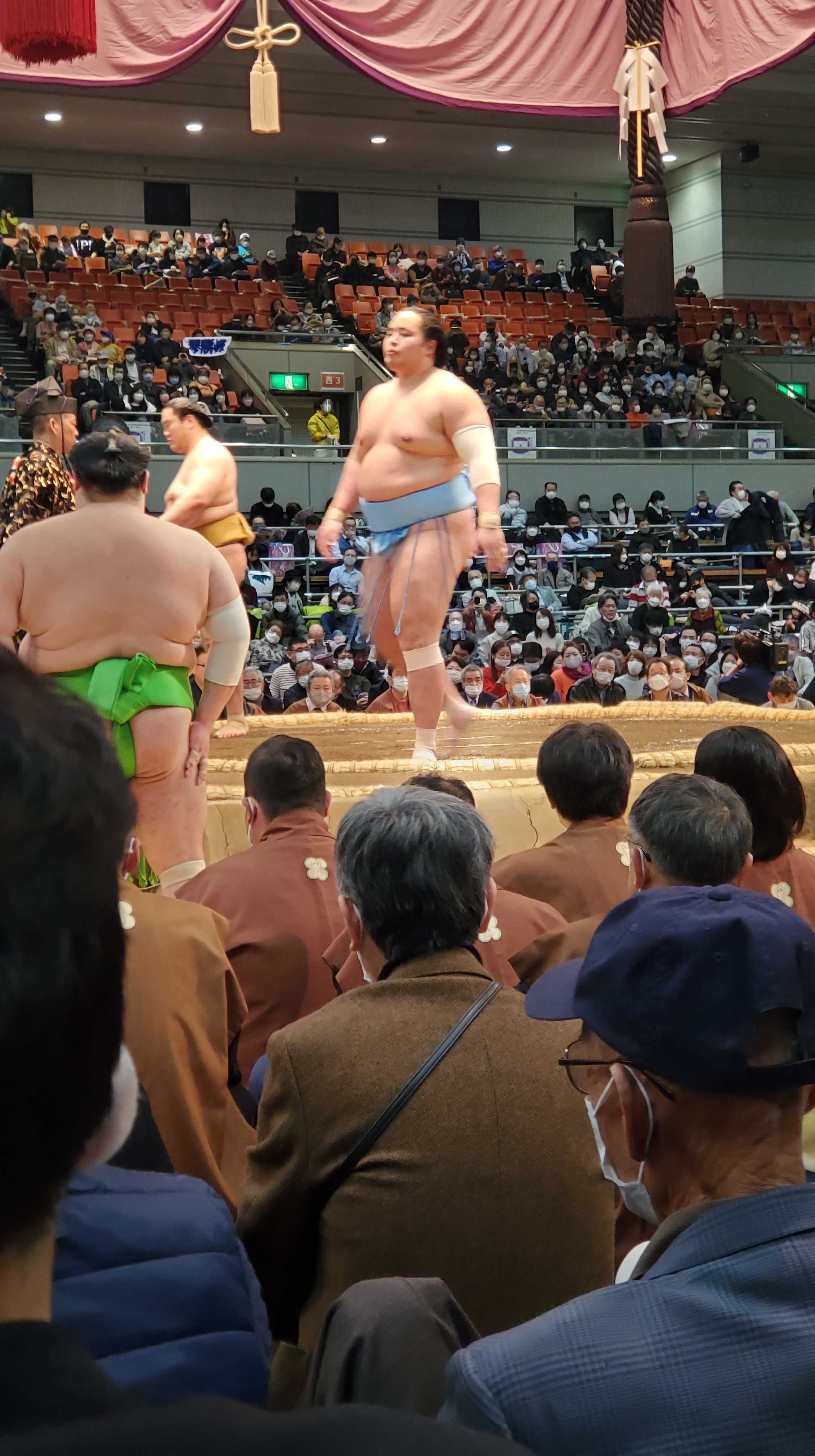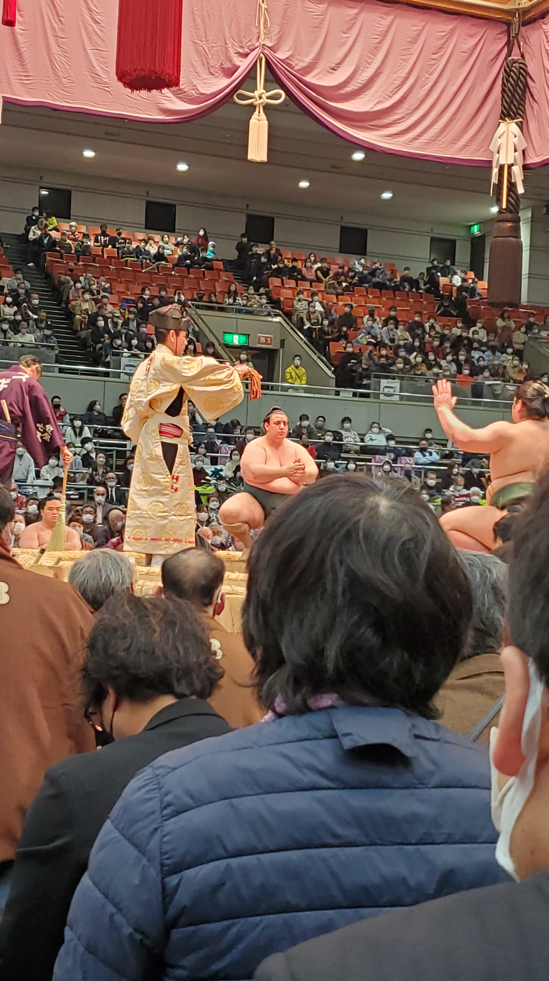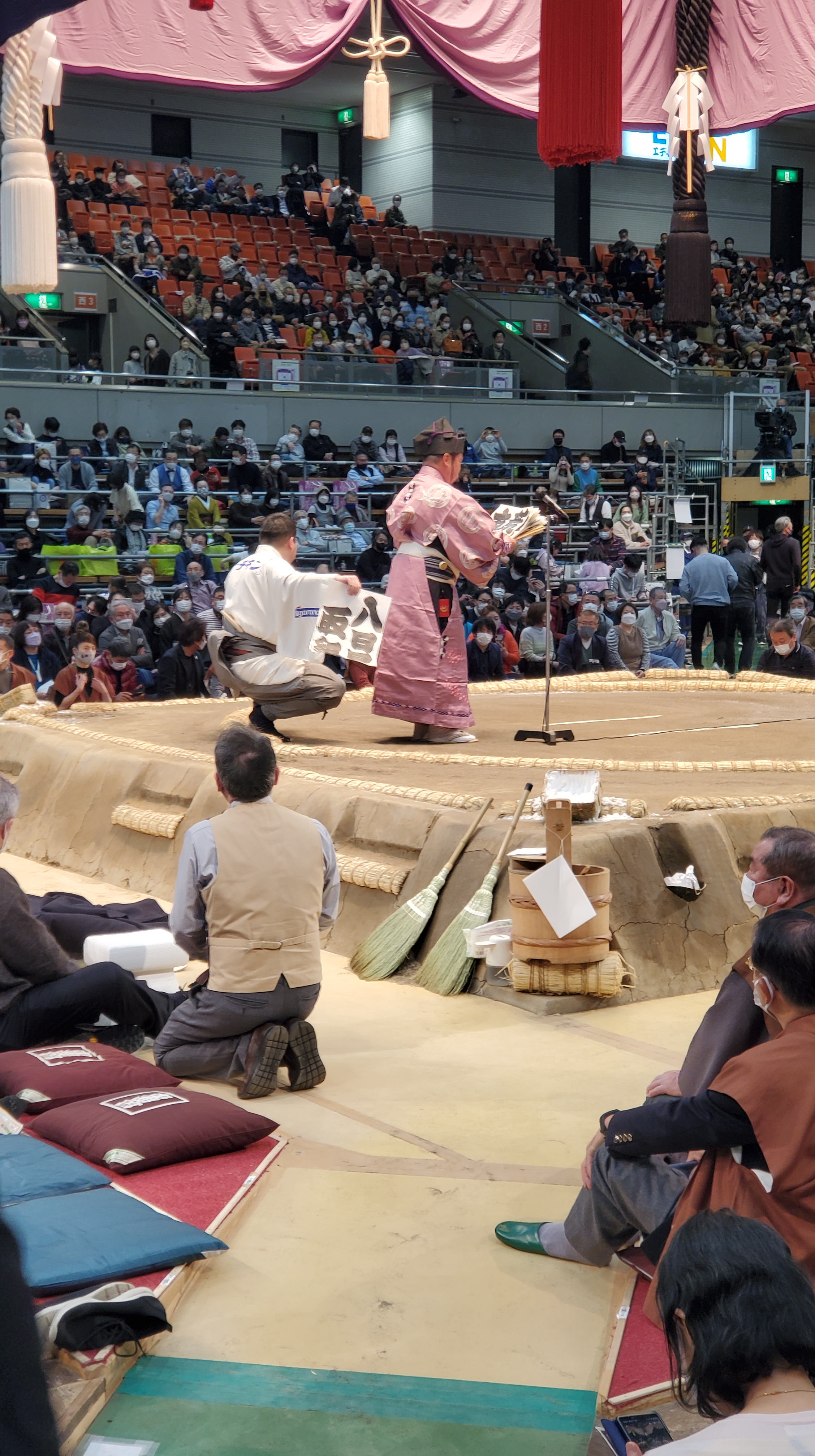 Prima della fine del Makushita ha luogo il 十両土俵入り Jūryō dohyō-iri, divisi fra est e ovest i lottatori salgono sul ring e vengono presentati dallo speaker (nome, proveniente, palestra). Che emozione vedere i lottatori famosissimi come 竜電 Ryūden, 熱海富士 Atamifuji, 炎鵬 Enhō, 魁聖 Kaisei, 王鵬 Ōhō e tutti gli altri.