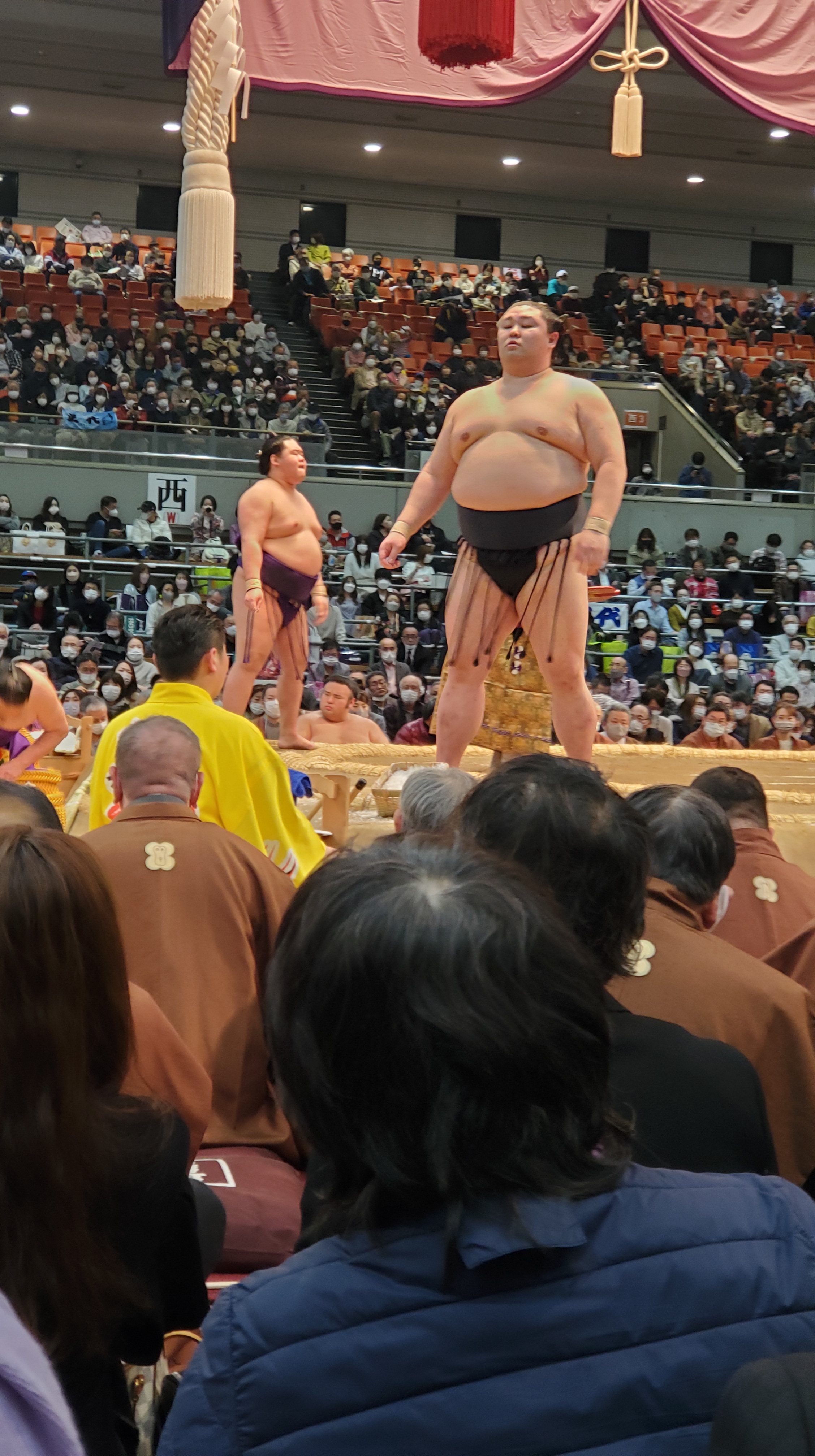 Sembra scontato ma vedere il sumo dal vivo ti cambia completamente la percezione di questo sport. La forza sprigionata nei tachi-ai, la velocità di esecuzione delle kimarite, l’atmosfera e la tensione, migliaia di persone che, come te, amano il sumo, lo commentano e ne sono emozionati. E poi gli ex lottatori in borghese che hanno fatto la storia, gli arbitri coi vestiti tradizionali e gli yobidashi tuttofare… Ognuno partecipa alla riuscita di un torneo che è anche una festa, un evento per intrattenere i fan ma anche la celebrazione della tradizione giapponese che si ritrova nei rituali di origine shintoista e i vestiti di Epoca Heian. Insomma ne è valsa la pena andare a vedere una giornata del Torneo di Osaka che non veniva nel capoluogo del Kansai da ben tre anni. Ho imparato e capito tantissime cose e la passione per il sumo è cresciuta notevolmente. Così tanto che a Osaka ci tornerò molto presto: sarò spettatore anche dell’ultimo giorno (千秋楽 senshūraku) ma da una postazione diversa. Non vedo l’ora!