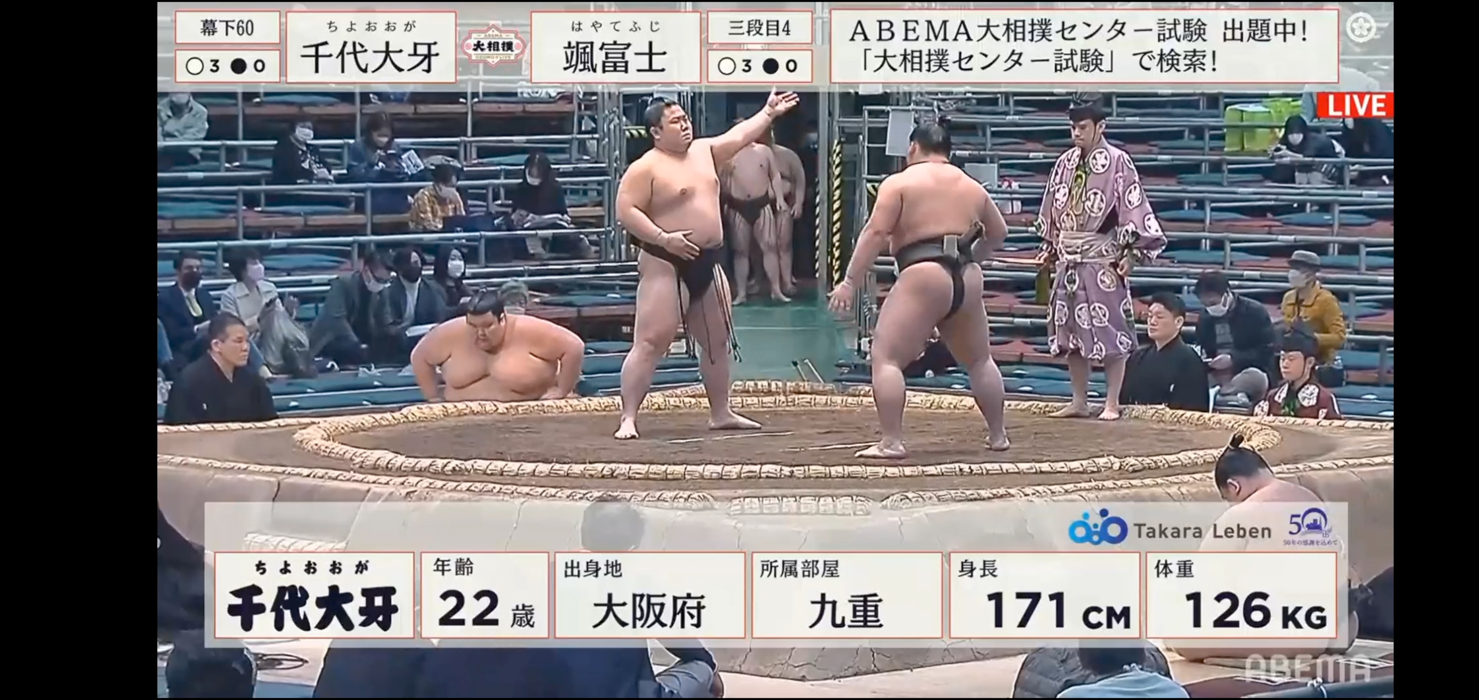 Lui è Ms58 出羽ノ城 Dewanojō, 248 kg di rikishi (vincitore dell’incontro).
