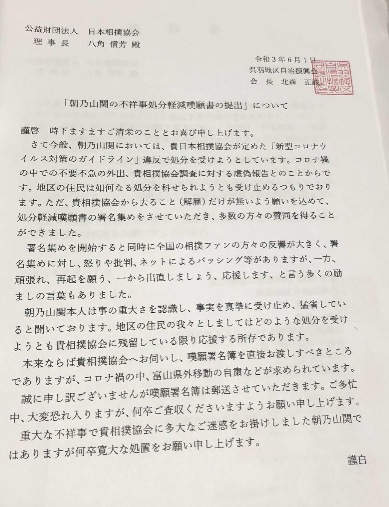 Infine una parola bisogna spenderla per 朝乃山 Asanoyama che torna sul dohyo dopo un anno di sospensione: da Ozeki predestinato dovrà ricominciare dalla divisione Sandanme. Rikishi amatissimo soprattutto nella sua Toyama, quando l’Associazione Sumo lo ha punito i suoi sostenitori hanno fatto una petizione per addolcirgli la pena e hanno raccolto 11.549 firme. La cosa probabilmente ha avuto poco effetto sull’Associazione ma ne ha avuto molto nel cuore di Asanoyama il quale ha ricevuto una copia del documento (in foto). Il suo capo palestra (ex Sekiwake 朝赤龍 Asasekiryu) ha detto: “Per sei mesi Asanoyama non era per niente in forma, ma dopo il basho di settembre ha ripreso il suo peso forma e così la motivazione.” fonte Isegahama oyakata ha semplicemente commentato con un “per ora il Sandanme, se si impegna potrà tornare in alto.” fonte