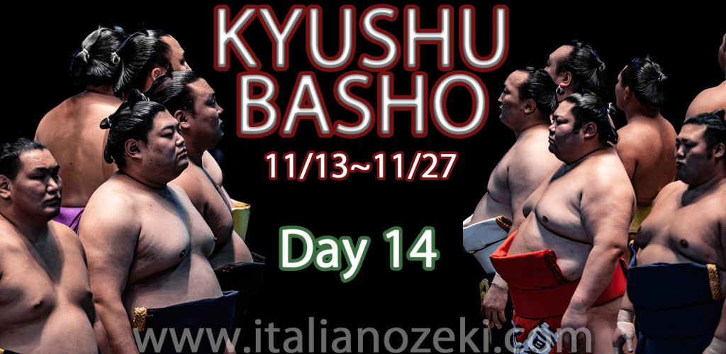Il nodowa di Tamawashi è sufficiente a garantirgli la vittoria su un sempre più fiacco Takarafuji. Tobizaru accetta il corpo a corpo col gigante Aoiyama e lo batte con un buon shitatenage costringendolo all’ottava sconfitta che vuol dire make koshi. Onosho trova scarsa opposizione in uno stanco Kiribayama (vedremo se ritroverà le energie domani contro l’amico/rivale Hoshoryu) e porta rapidamente a casa il match contro il komusubi. Wakatakakage non è al top della forma in questo basho ma il suo attacco dal basso e la sua spinta bastano a raggiungere il kachi koshi, sconfiggere Hokutofuji e infliggergli l’ottava sconfitta che significa make koshi. Hoshoryu fallisce la sua possibilità di restare in corsa per il basho e la regala ad Abi che combatte più sereno e con esperienza la porta a casa. Hoshoryu attacca bene e si vede che vuole evitare le lunghe braccia di Abi su collo e viso ma manca la presa frontale sul mawashi, prova ad attaccare a testa bassa ma si sbilancia troppo in avanti, inashi di Abi e il giovane mongolo finisce oltre la corda. Oho si è dimostrato molto cresciuto sia come convinzione sia come mentalità ma il suo sumo è ancora carente di quei dettagli che solo l’esperienza consente di acquisire e perfezionare. Resiste alla prima carica e prova a ribattere ma l’ozeki controlla senza problemi e aumentando i giri del motore spedisce oltre il tawara il giovane (4 anni più giovane di lui ..) avversario. Domani dovrà attendere il risultato del match di Takayasu e sconfiggere Wakatakakage per avere ancora speranze di alzare la coppa dell’imperatore. Chiude la giornata lo scontro (trentesimo fra i due) fra i “furono ozeki” (si va beh Shodai ancora sulla carta lo è fino a domani) Mitakeumi e Shodai. Prima carica a favore del sekiwake poi contrattacco e vittoria per Shodai. Make koshi per mitakeumi e saluto anche al rank di sekiwake…