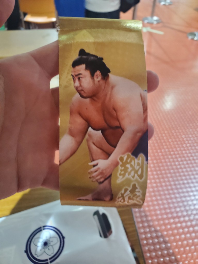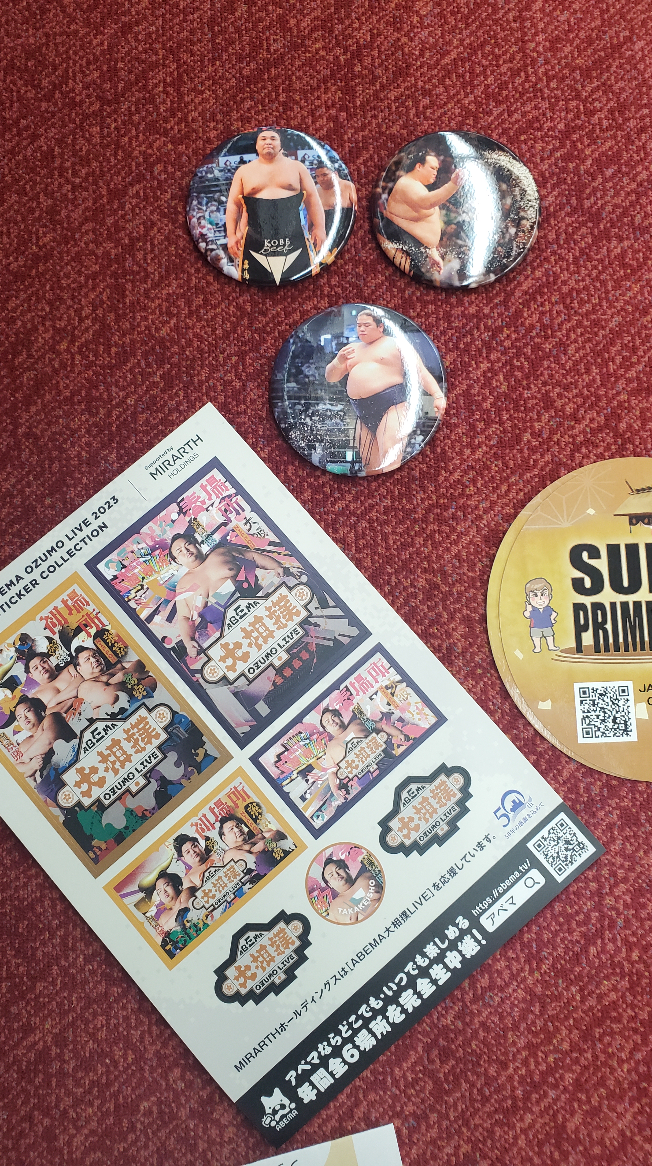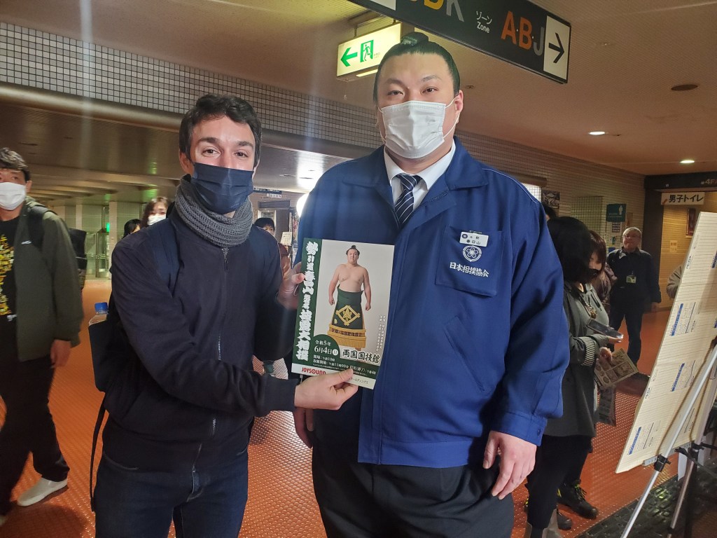 A sinistra dell’entrata invece troviamo lo stand dove vendono le spille dei lottatori, la lotteria per gli iscritti al Fan Club di Sumo e il centro informazioni dove all’improvviso spunta… Ikioi!
