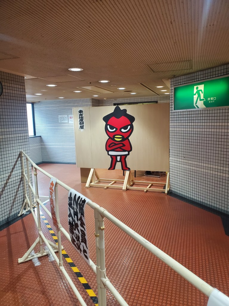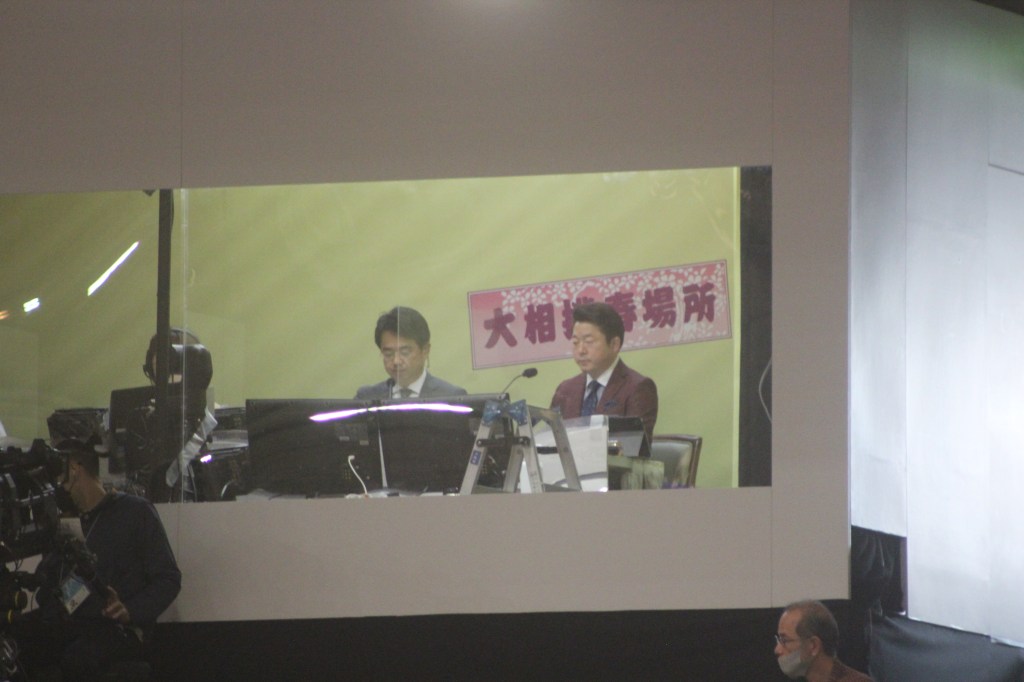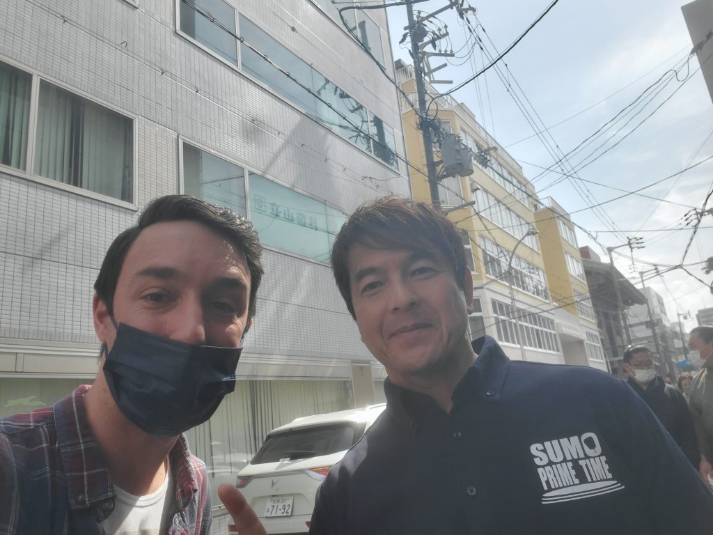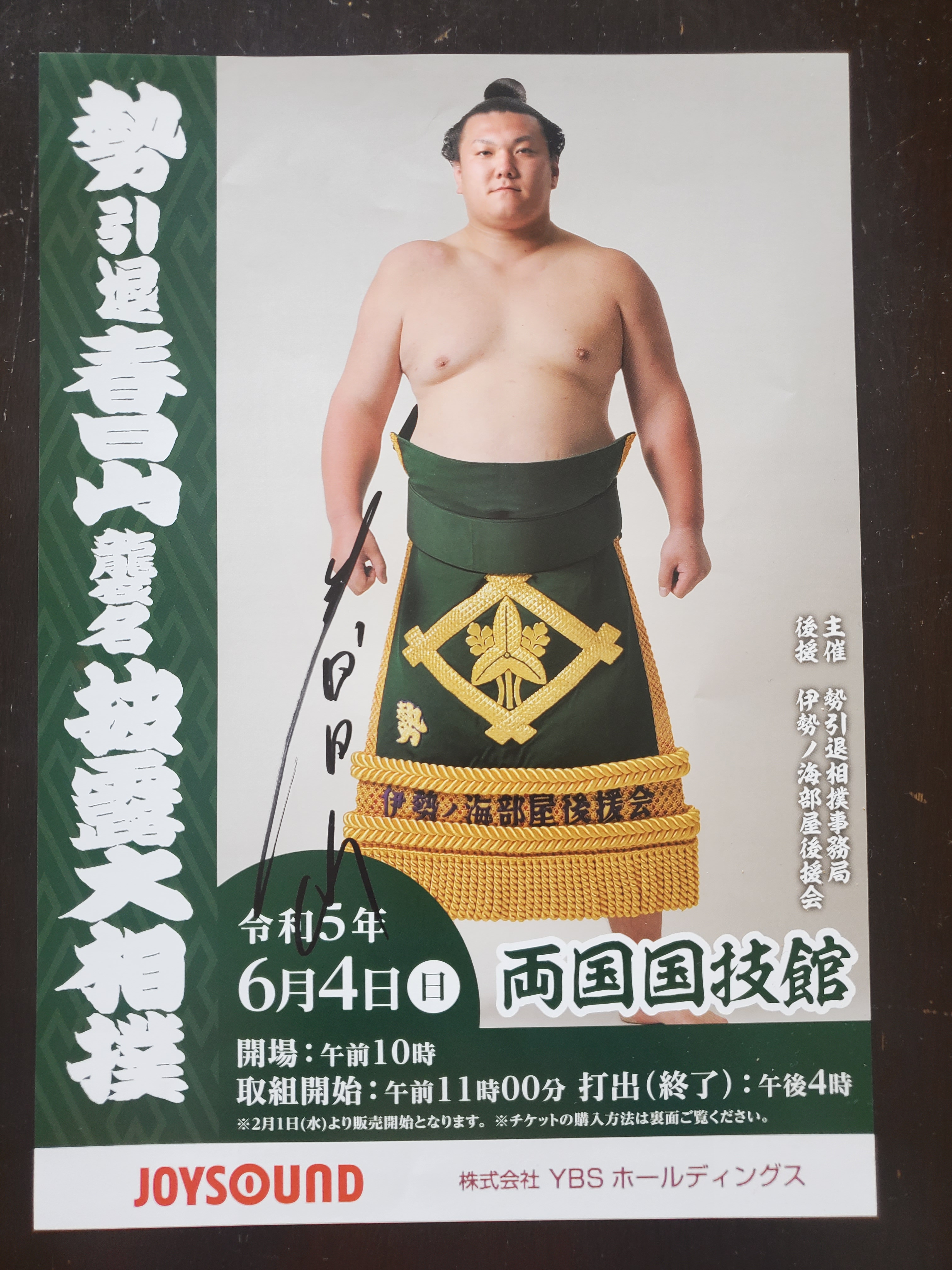A sinistra dell’entrata invece troviamo lo stand dove vendono le spille dei lottatori, la lotteria per gli iscritti al Fan Club di Sumo e il centro informazioni dove all’improvviso spunta… Ikioi!