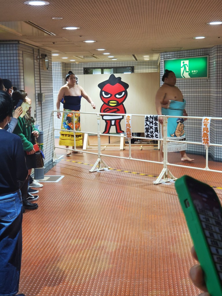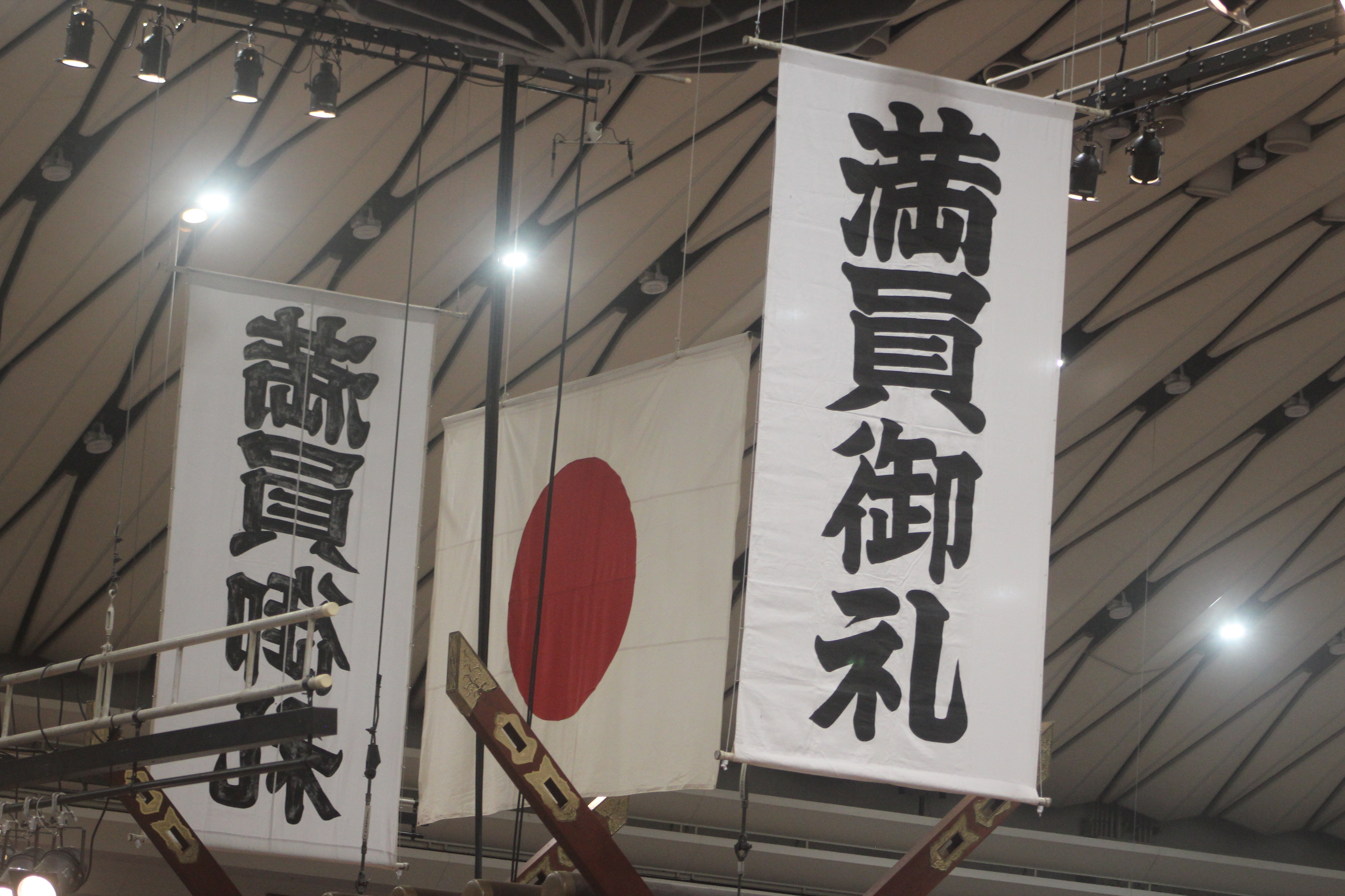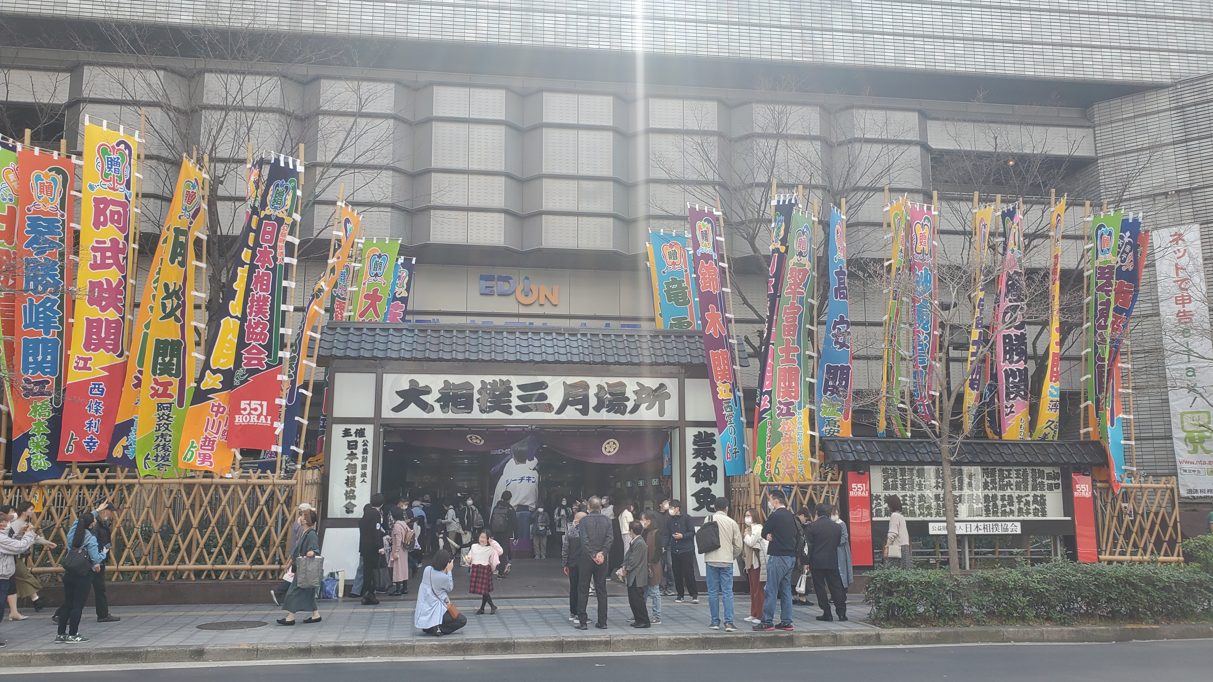 L’entrata della Edion Arena ci propone un vasto repertorio di stendardi dei rikishi Makuuchi e Juryo, per entrare si deve passare sotto la scritta 大相撲三月場所 (Torneo di Sumo di Marzo).