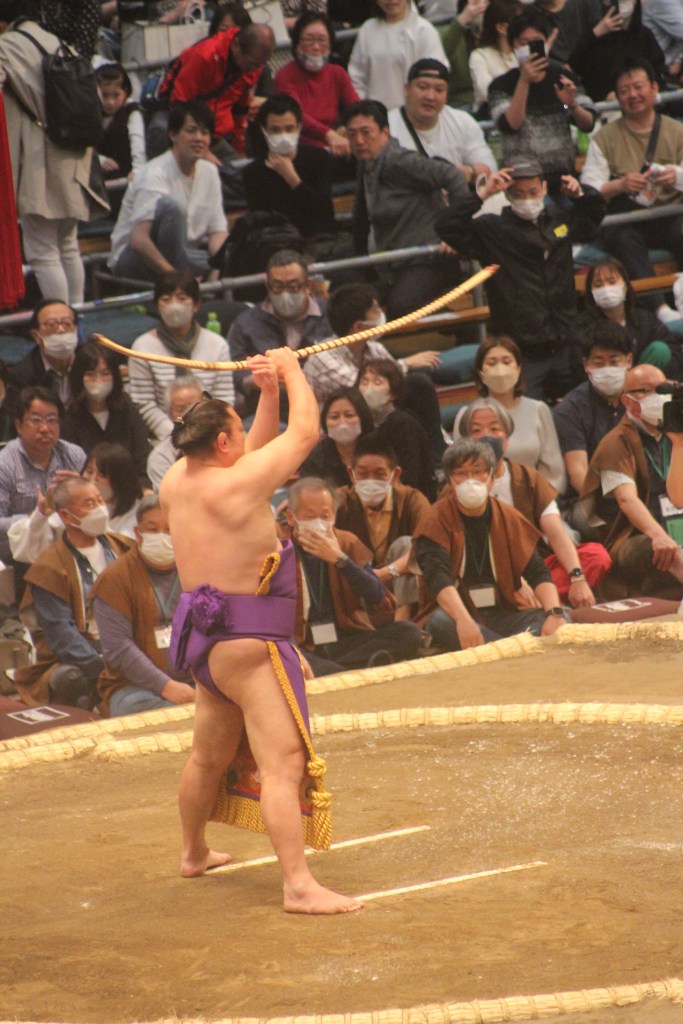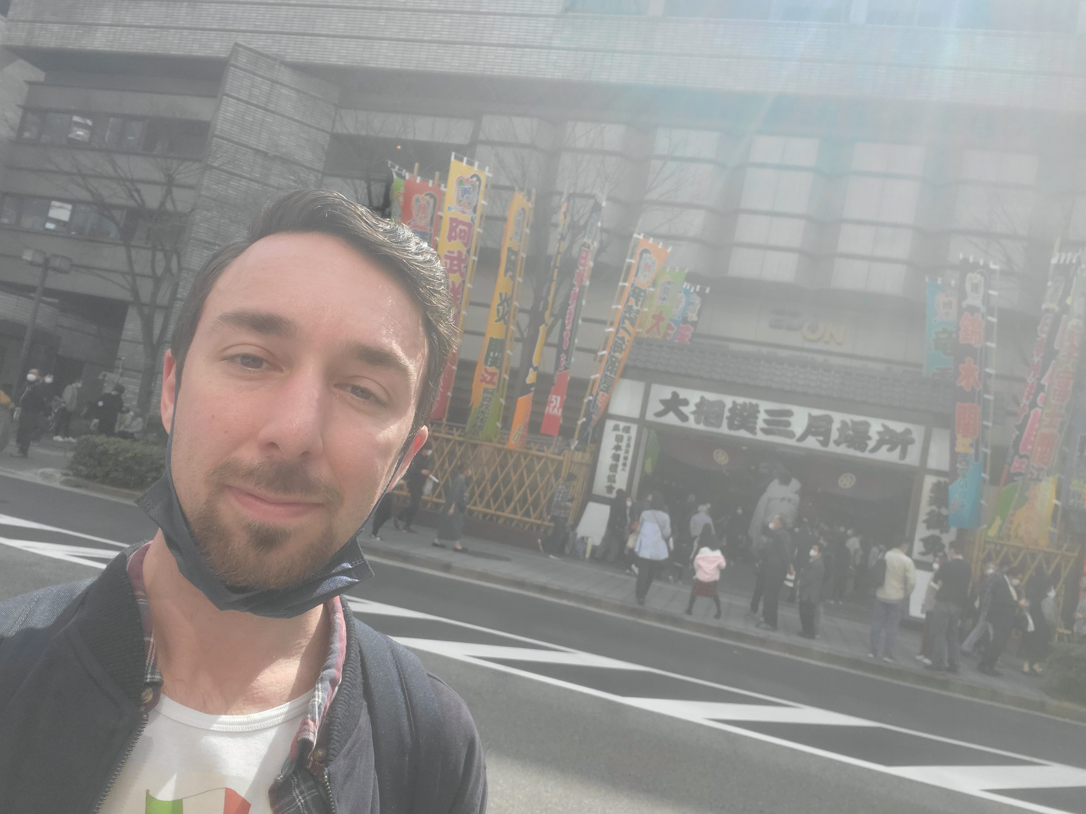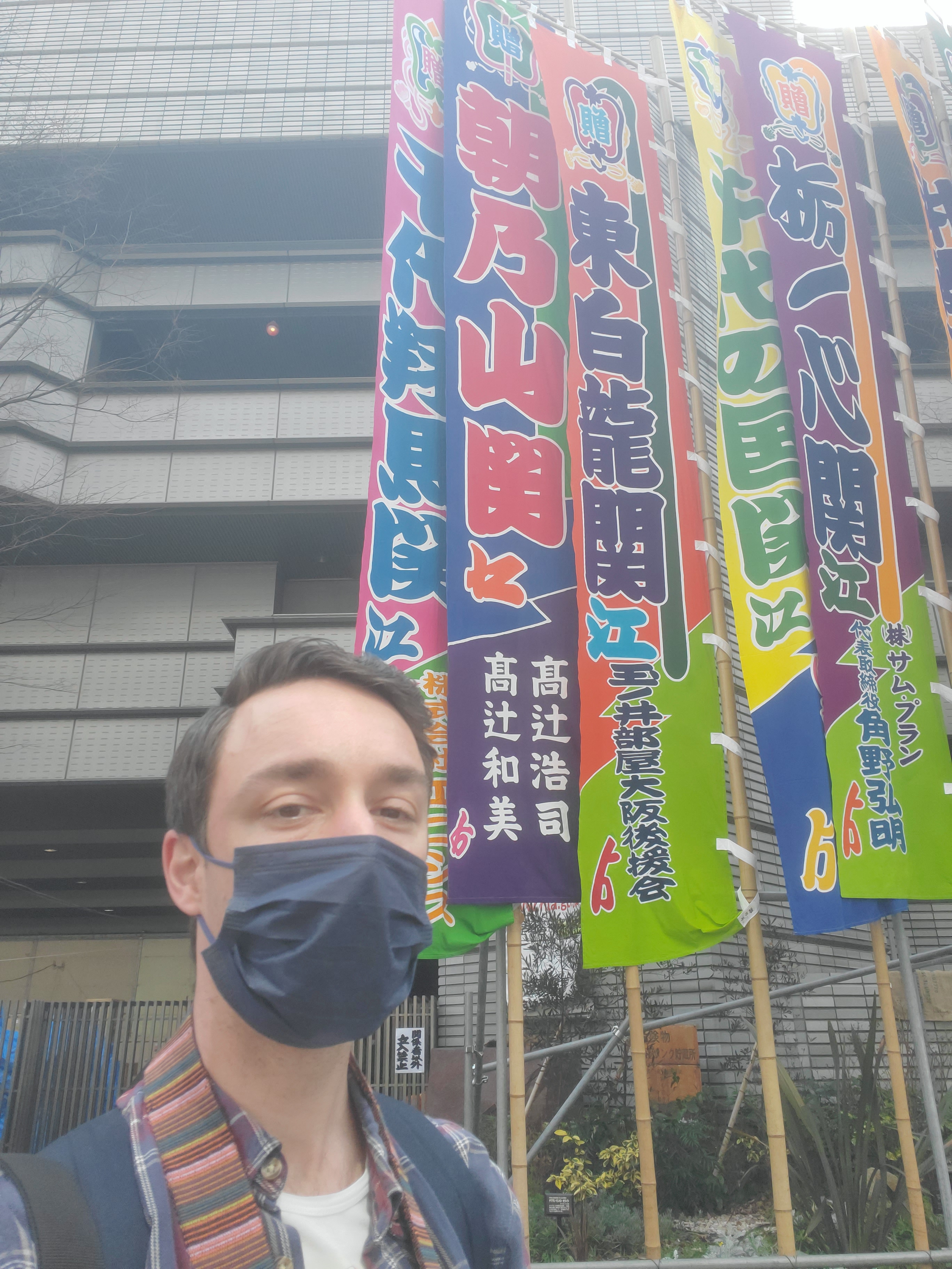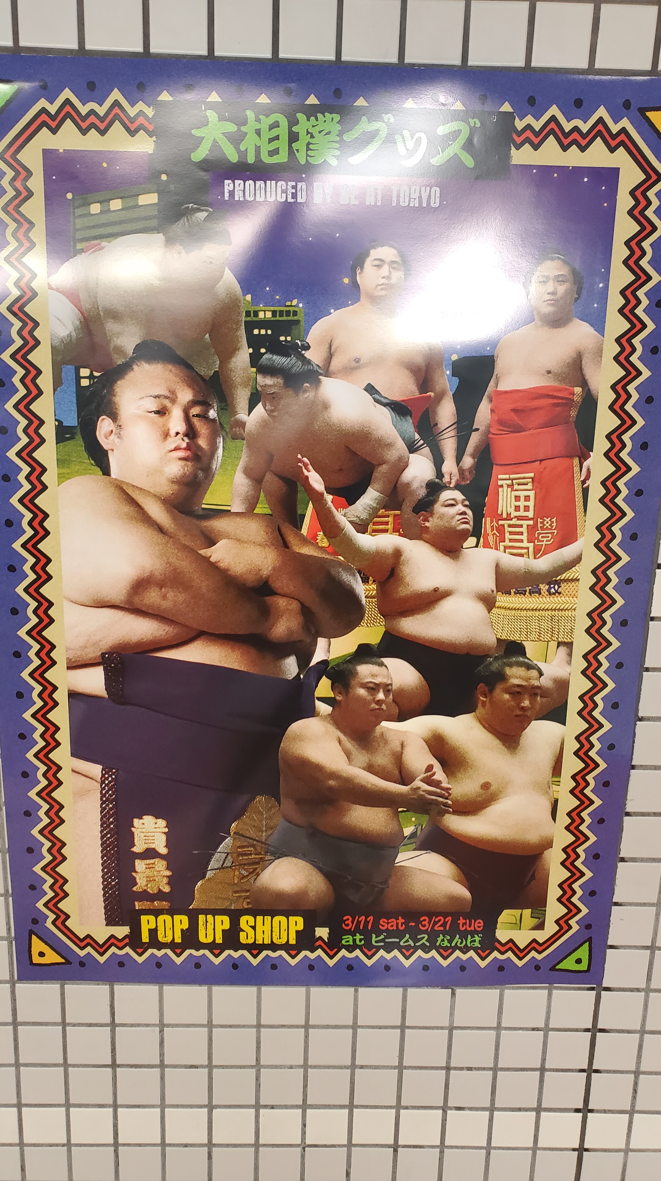 L’entrata della Edion Arena ci propone un vasto repertorio di stendardi dei rikishi Makuuchi e Juryo, per entrare si deve passare sotto la scritta 大相撲三月場所 (Torneo di Sumo di Marzo).