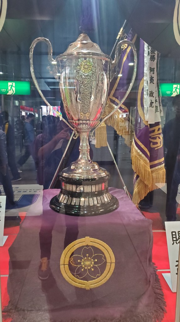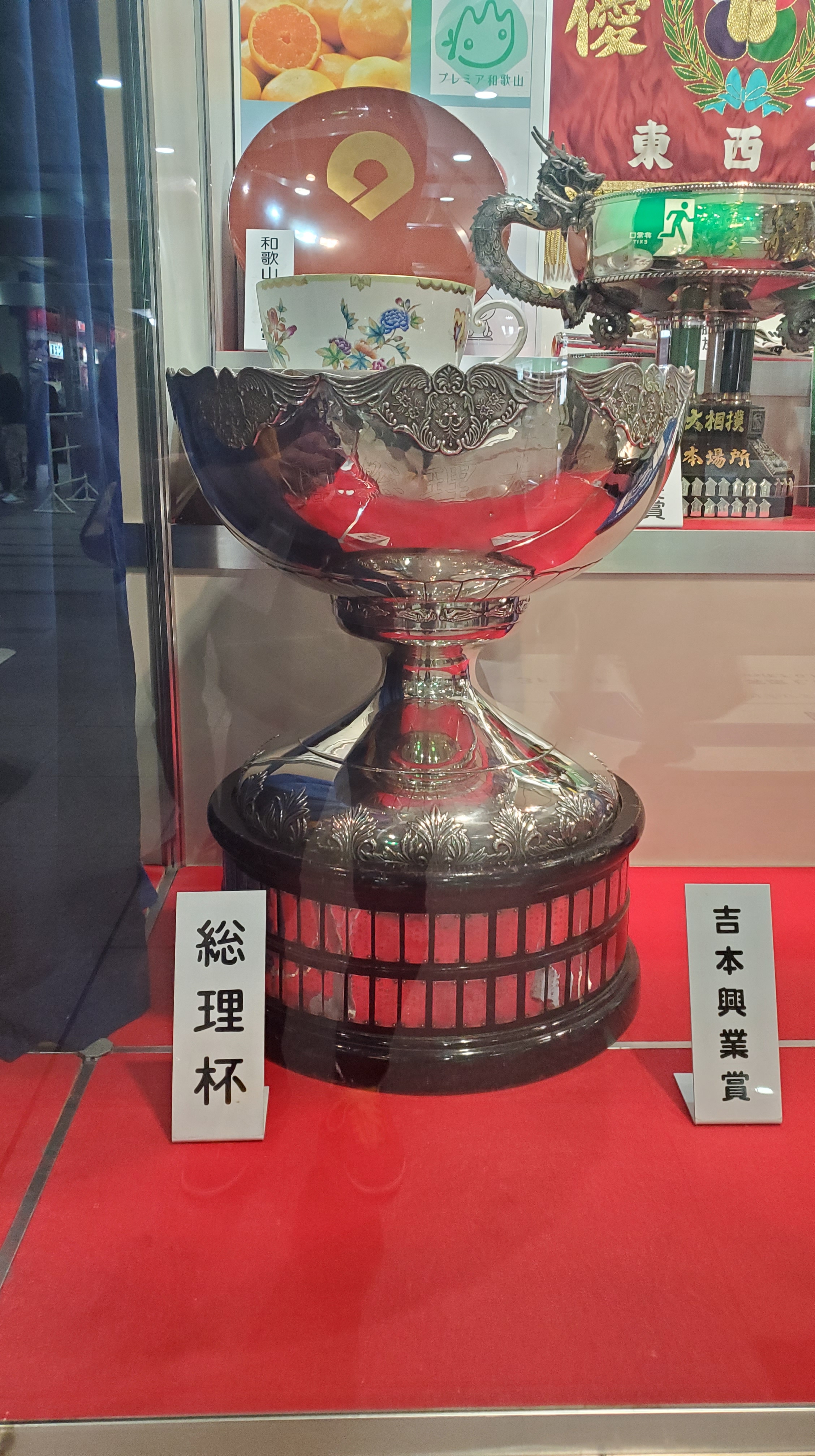Validato il biglietto di fronte a noi ci troviamo la bacheca con tutti i premi che verranno consegnati ai vincitori del Torneo, sia quelli speciali che quelli per il Campione Makuuchi.