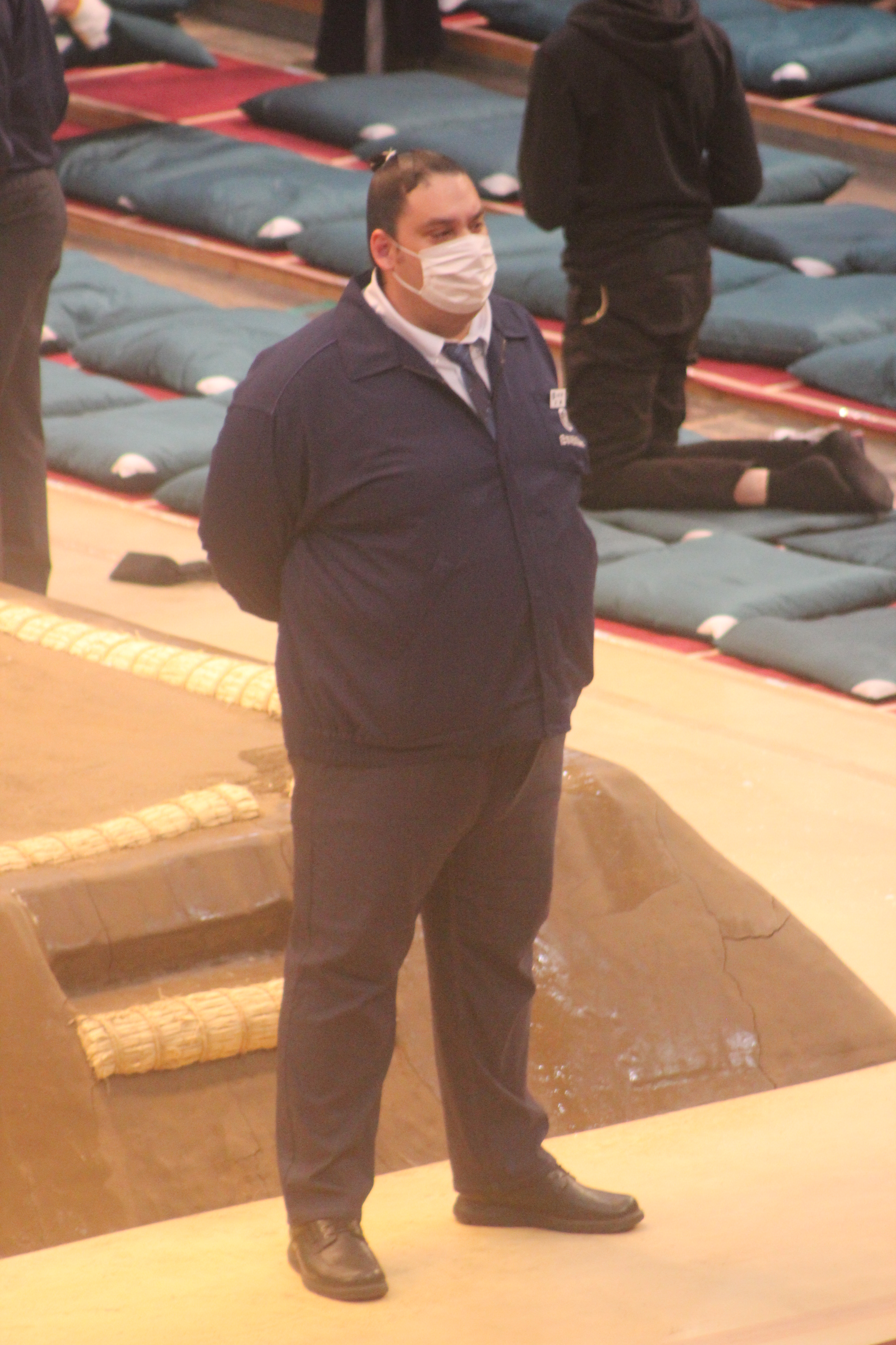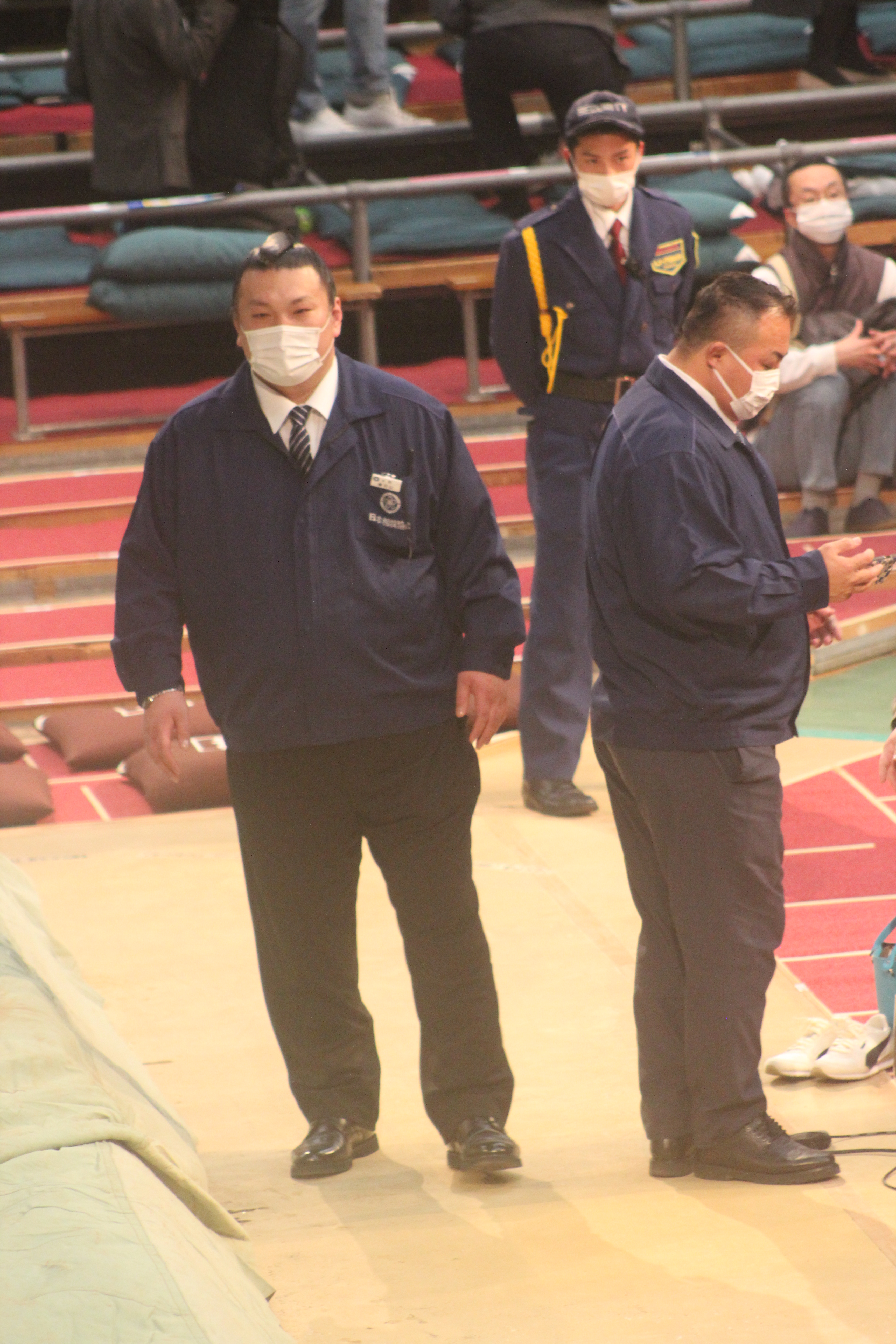 A fine giornata gli oyakata circondando il dohyo per evitare che le persone ci salgano sopra. L’anno scorso se ne presentavano di più, quest’anno sono pochi.