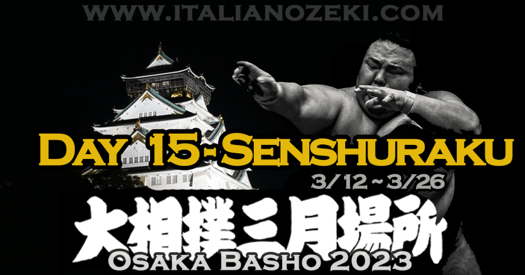 Sanyaku che arriva quanto mai rimaneggiato alla fine di questo torneo, e che perderà Tobizaru nel prossimo banzuke. La scimmia volante comunque oggi limita i danni e vincendo sontro Sadanoumi chiude a 6-9 e attutisce il colpo. Buon tachi ai e ottima spinta a seguire per Kotonowaka contro Wakamotoharu, che però come ha mostrato piu’ volte anche in questo torneo deve essere allergico alla corda perché quando i suoi piedi la toccano scatta qualcosa di clamoroso spesso e volentieri. Oggi costretto sul tawara tenta una mossa disperata con un utchari pirotecnico e pericoloso che lascia tutti col fiato sospeso nel vedere l’atterraggio dei due lottatori fuori dal dohyo. Il mono ii conferma che l’azzardo è stato buono e che Kotonowaka tocca per primo col piede oltre la corda quindi successo per Wakamotoharu. Veniamo ora al match clou, Daieisho parte come razzo, carico e deciso inizia a martellare Kiribayama come un fabbro con nodowa e tsuppari uniti alla spinta che in breve portano il neo sekiwake alla corda! Li scatta la molla nel giovane mongolo che riesce a fare un inashi rapidissimo e far volare oltre la corda l’avversario sullo slancio. Si va allo spareggio, Kiribayama appare molto concentrato e determinato, Daieisho ha gli occhi della tigre ma lascia trasparire un po’ di delusione per il match precedente. Pronti via e sembra di vedere un replay del primo match: Daieisho che attacca e Kiribayama in difesa, stavolta però riesce a controllare le braccia e la posizione dell’avversario, la mossa è la stessa e l’esito pure ma con meno istinto e piu’ cognizione. Viene chiamato il mono ii ma era chiaro che il piede di kiribayama avesse toccato dopo la mano di Daieisho anche perché ci va a finire sopra.. Yusho per Kiribayama e nel prossimo torneo un risultato di 10 vittorie vorrebbe dire anche Ozeki.