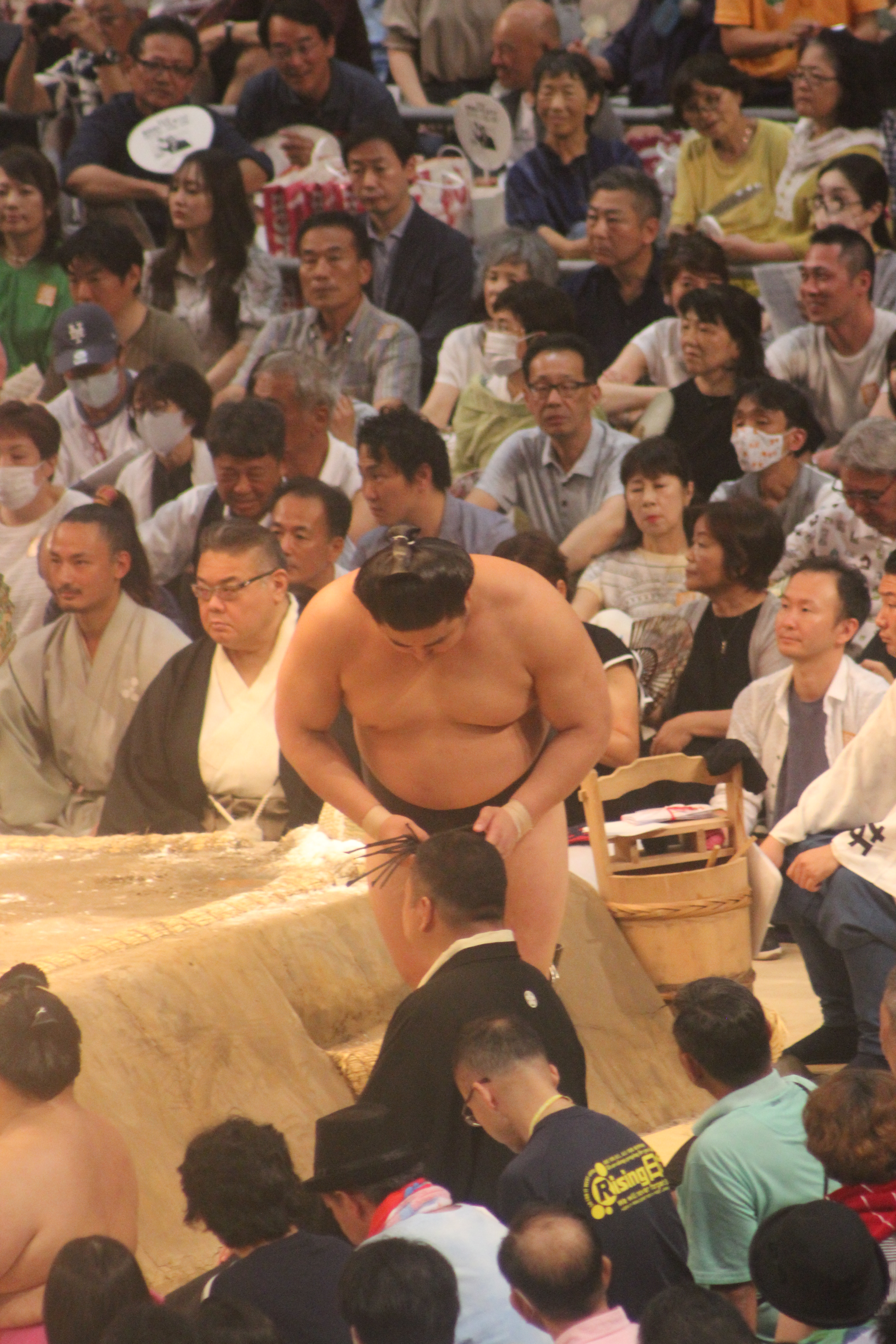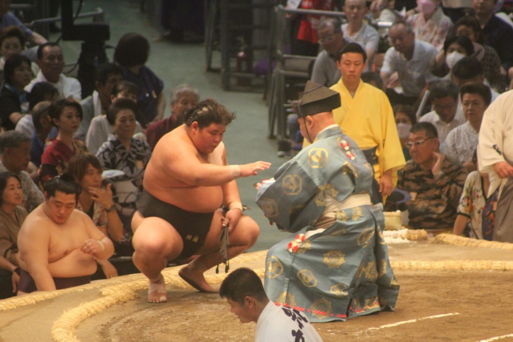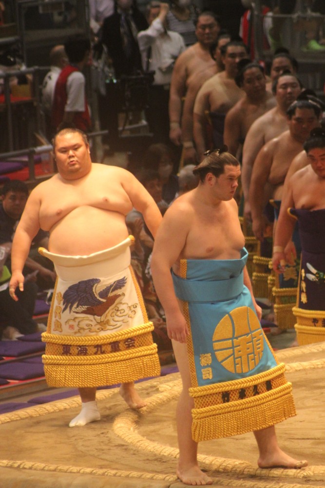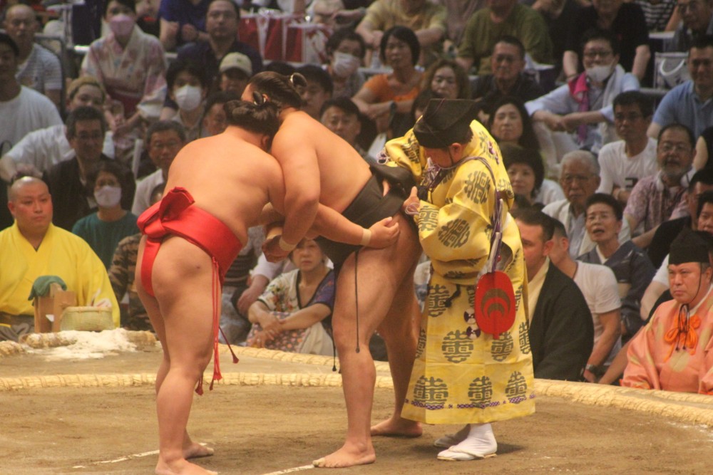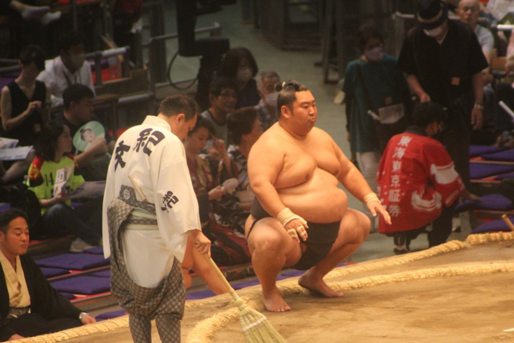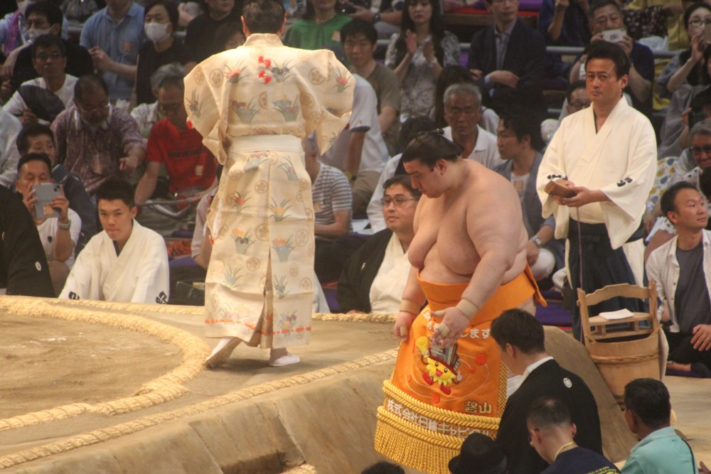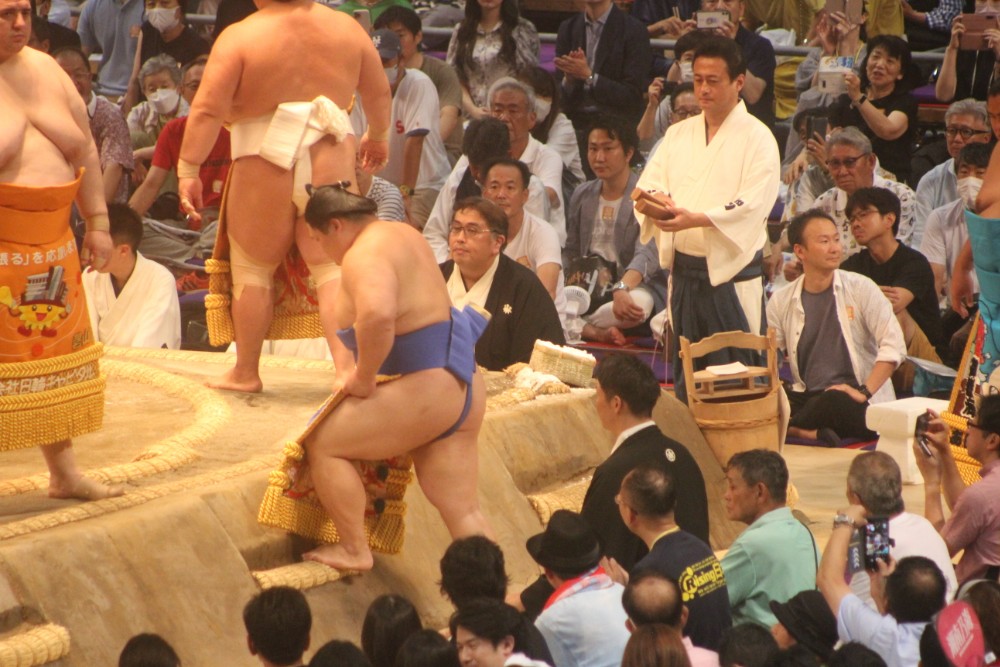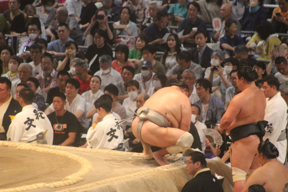 L’ultimo match di giornata tra lo shin Ozeki Kirishima e M3 Midorifuji ha riservato uno spettacolo inaspettato per il pubblico presente: il mawashi di Kirishima ha iniziato a slacciarsi durante la lotta concitata e il gyoji è dovuto intervenire interrompendo il match e – con l’aiuto di un attendente – lo ha rilegato saldamente. Di seguito tutta la scena immortalata fotograficamente, con tanto di ‘chiacchierata’ tra arbitro e giudice a bordo dohyo per rimettere precisamente i due rikishi nella posizione di partenza.