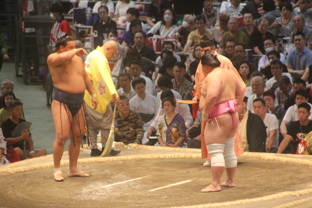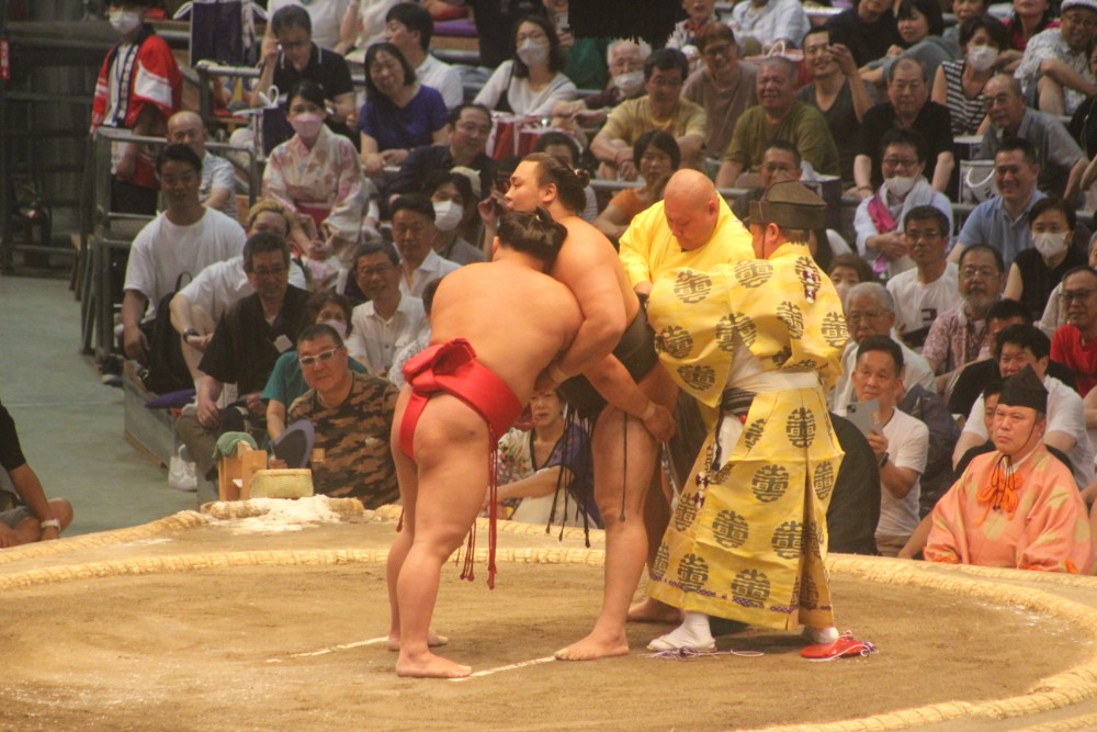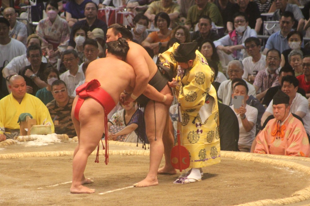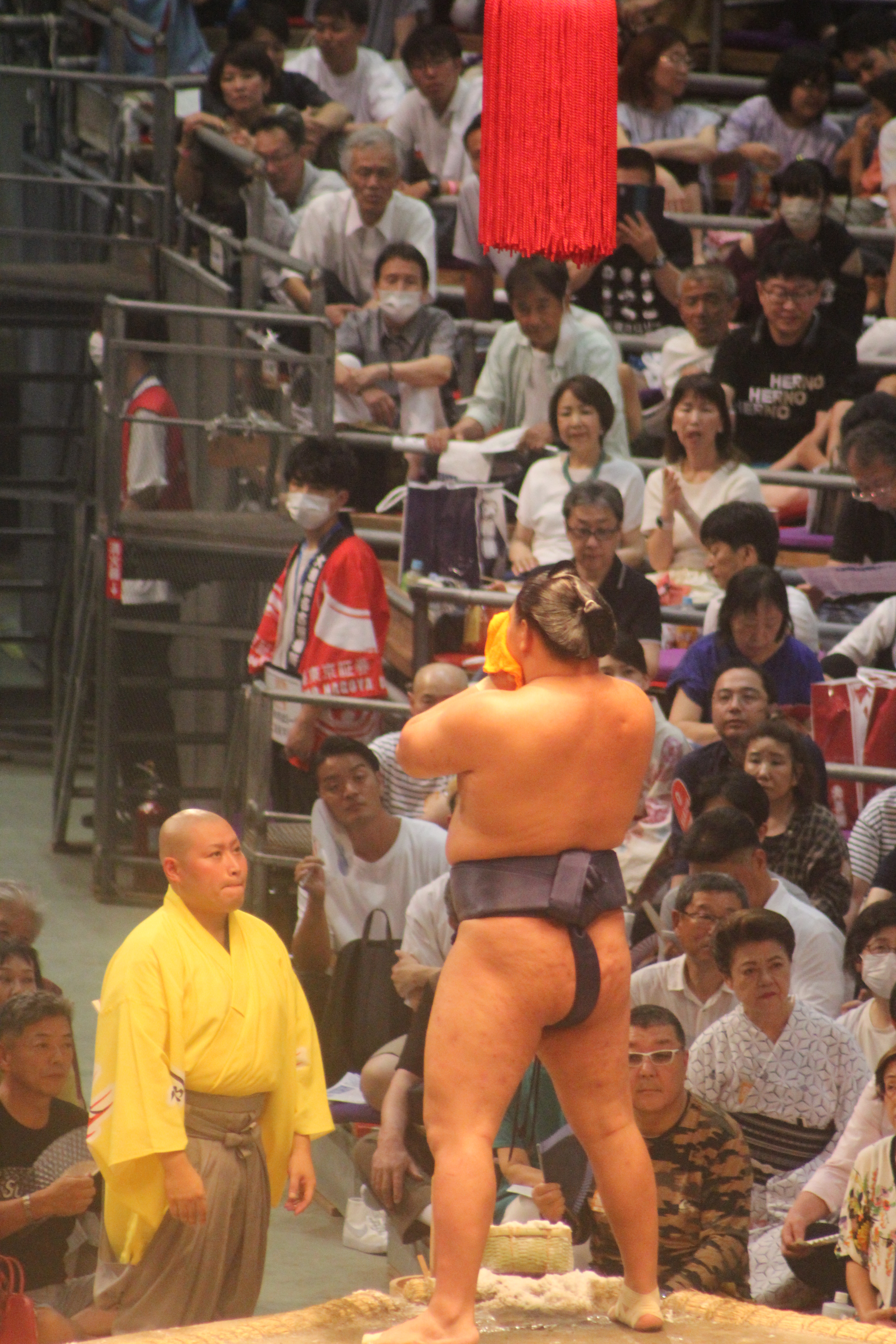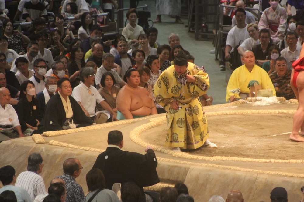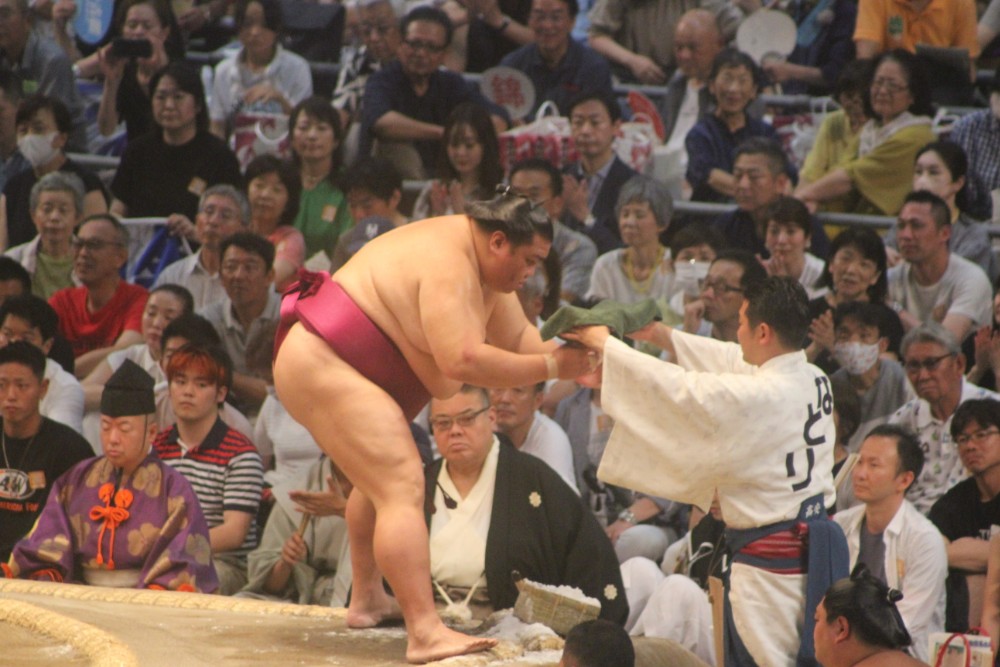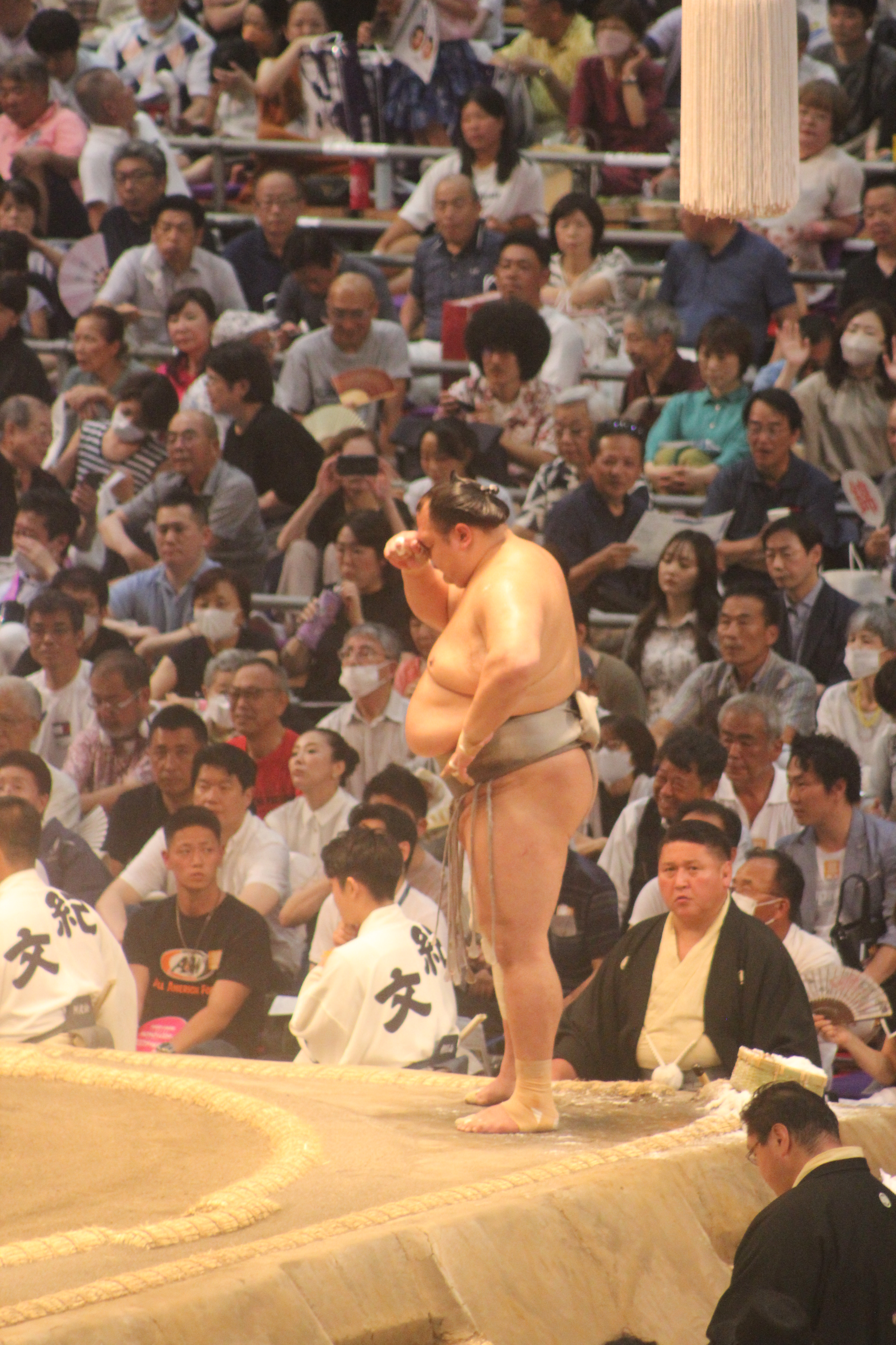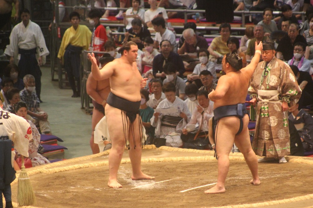 L’ultimo match di giornata tra lo shin Ozeki Kirishima e M3 Midorifuji ha riservato uno spettacolo inaspettato per il pubblico presente: il mawashi di Kirishima ha iniziato a slacciarsi durante la lotta concitata e il gyoji è dovuto intervenire interrompendo il match e – con l’aiuto di un attendente – lo ha rilegato saldamente. Di seguito tutta la scena immortalata fotograficamente, con tanto di ‘chiacchierata’ tra arbitro e giudice a bordo dohyo per rimettere precisamente i due rikishi nella posizione di partenza.