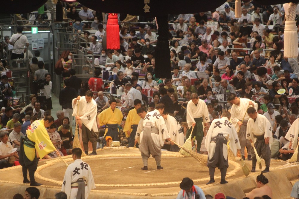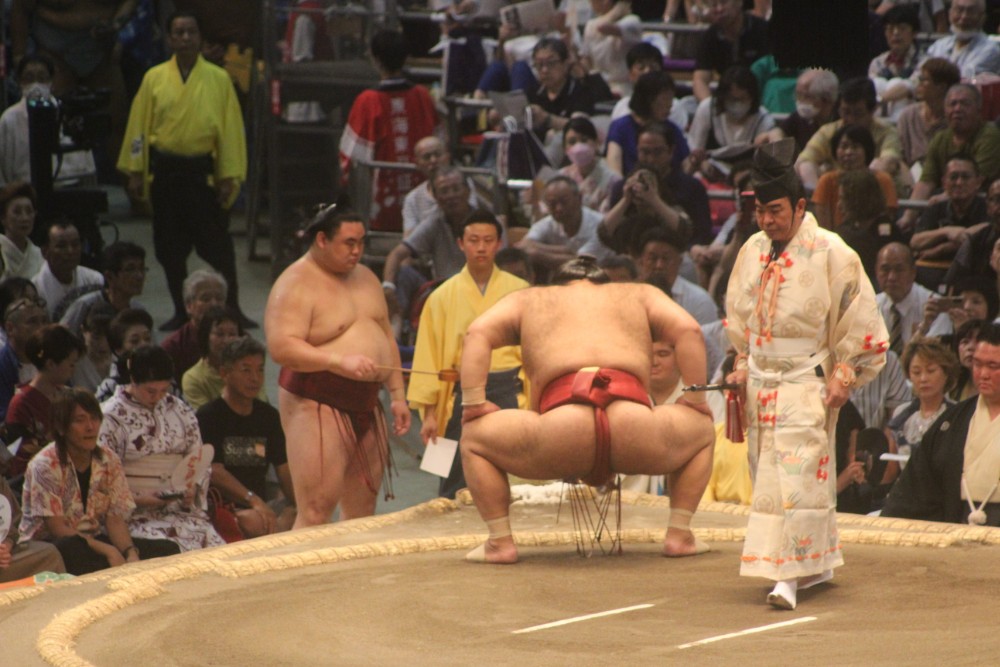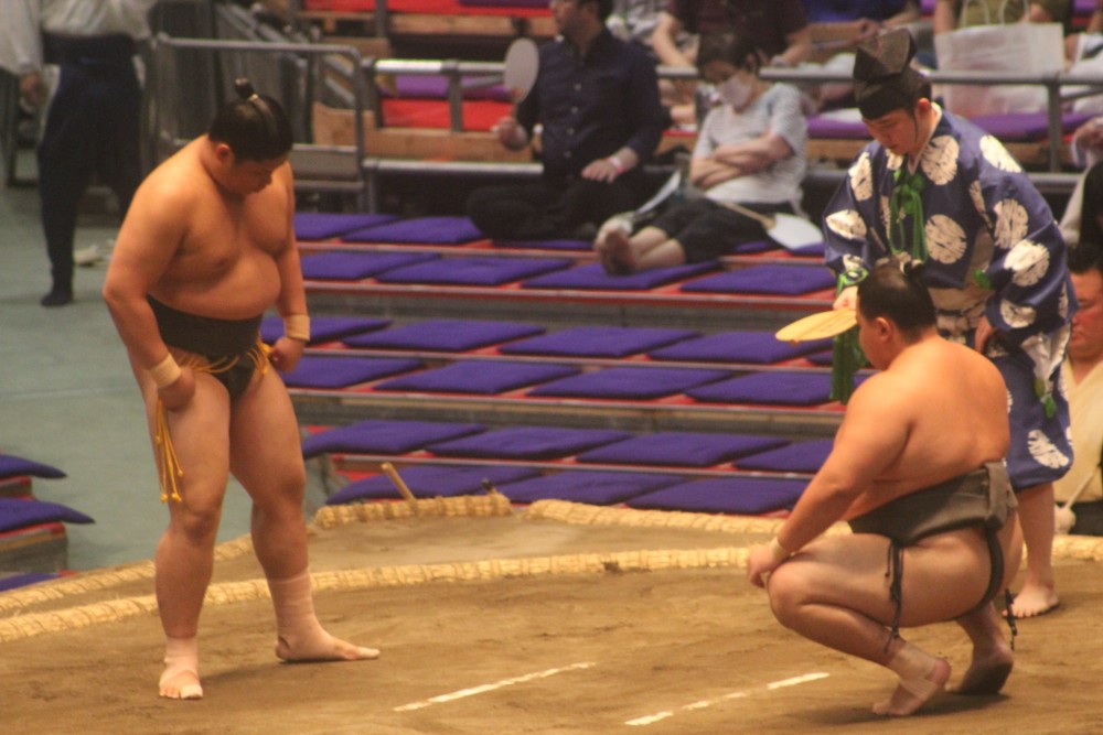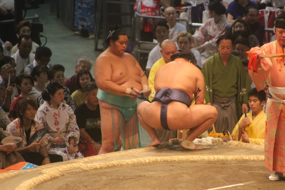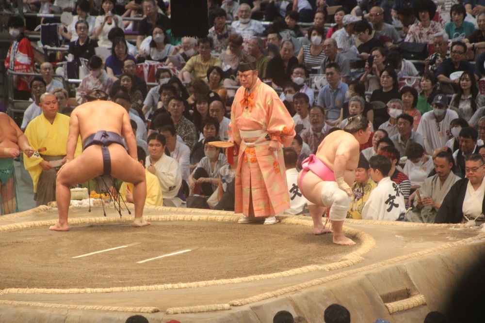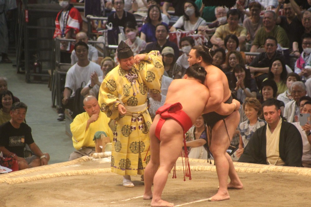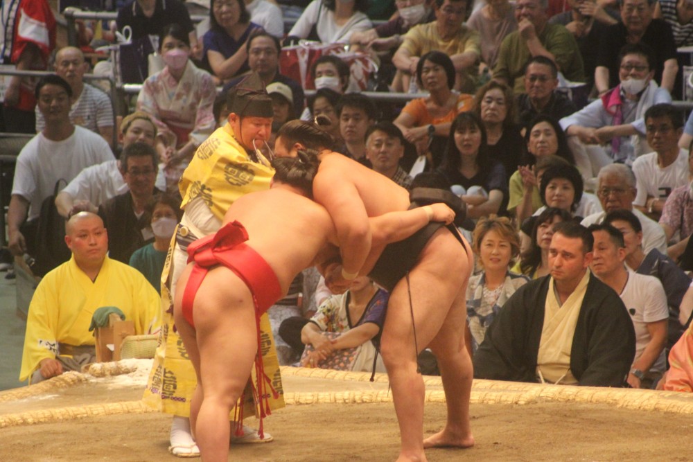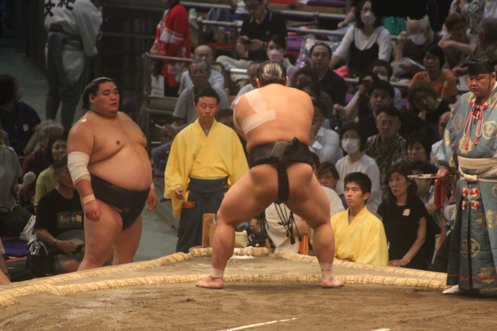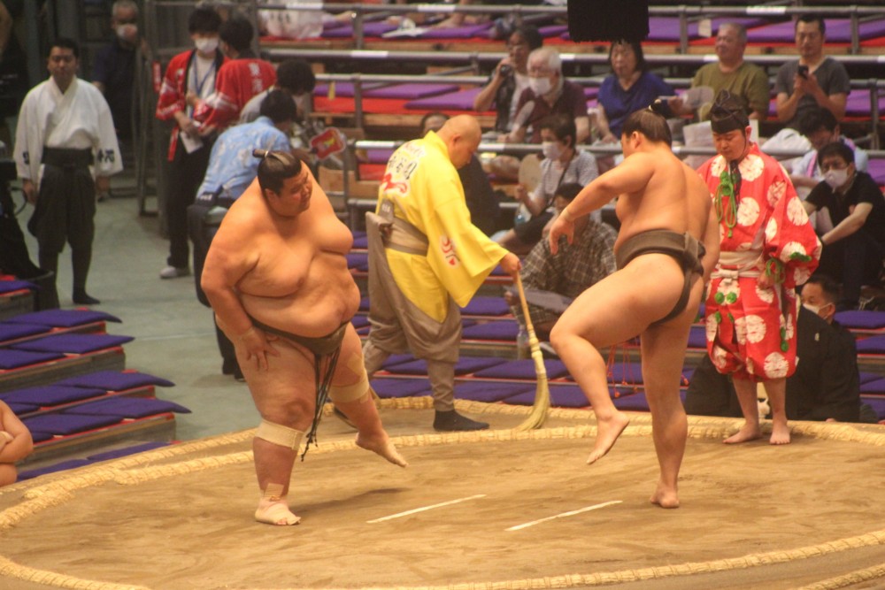 L’ultimo match di giornata tra lo shin Ozeki Kirishima e M3 Midorifuji ha riservato uno spettacolo inaspettato per il pubblico presente: il mawashi di Kirishima ha iniziato a slacciarsi durante la lotta concitata e il gyoji è dovuto intervenire interrompendo il match e – con l’aiuto di un attendente – lo ha rilegato saldamente. Di seguito tutta la scena immortalata fotograficamente, con tanto di ‘chiacchierata’ tra arbitro e giudice a bordo dohyo per rimettere precisamente i due rikishi nella posizione di partenza.