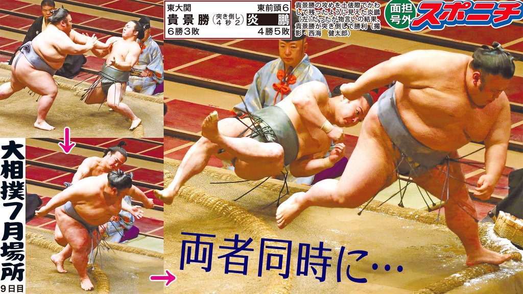 In che modo un lottatore può ritrovarsi in tale condizione? Semplice, in seguito all’attacco dell’avversario che lo costringe con la sua iniziativa a perdere l’equilibrio e a non poter evitare la caduta o l’uscita fuori dal dohyo. Questo principio è la chiave per capire bene come viene applicata la regola dello shini-tai e in che momento un lottatore viene riconosciuto in tale posizione. Il principio dell’iniziativa (che è presente anche in altri sport) va a premiare il lottatore che attacca, chi si difende deve farlo in modo da non ricadere in posizioni non recuperabili pertanto salti clamorosi ad evitare il tuffo dell’avversario in spinta sono utili solo se l’atterraggio può avvenire all’interno dei limiti del doyho e senza che si vada a toccare con altre parti del corpo che non siano le piante dei piedi. Spesso capita di vedere lottatori molto agili compiere clamorosi salti sul limite della corda per evitare il pieno impatto dell’avversario che letteralmente gli si tuffa addosso in stile placcaggio rugbistico. Beh, spesso tale manovra è inutile perché se si riesce ad evitare completamente l’impatto (praticamente impossibile viste le brevi distanze fra i lottatori) si finisce oltre la corda e anche se ci si trova ancora in aria quando l’attaccante tocca terra si è ovviamente sconfitti. Se invece, come accade nel 99% dei casi si subisce l’impatto e saltando lo si evita parzialemente, si subisce una spinta sulla parte bassa del corpo che porterebbe a non poter atterrare il salto in modo “legale” ossia appoggiando solo la pianta dei piedi. Anche in tal caso nonostante ci si trovi ancora in aria quando l’attaccante tocca terra si è sconfitti.