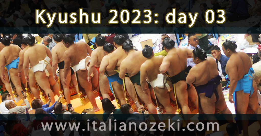 Questo Kyushu basho sembra essere iniziato in modo regolare e poco prodigo di sorprese clamorose e ribaltoni, anche la giornata odierna, la terza del torneo, è andata via liscia con diverse prestazioni dominanti, alcuni incontri vivaci ed interessanti e un buon livello di sumo. Il match of the day di oggi ce lo regalano Kotonowaka e Meisei che hanno dato vita ad un incontro frizzante e ricco di emozioni. Tachi ai deciso di Meisei ma Kotonowaka non fa una piega, porta blocco sulle braccia mentre l’avversario va in spinta. Kotonowaka trova la presa con la mano destra e concede a sua volta il mawashi al suo opponente , i due danno vita ad uno splendido confronto alla cintura e alternativamente si forzano ripetutamente in prossimità del tawara con spinte e tentativi di proiezione. I due sistemano le prese e Meisei va profondo con il braccio sinsitro sulla parte posteriore del mawashi del sekiwake mentre Kotonowaka tiene una presa solida più laterale. Dopo una fase di studio vicini alla corda Mesiei lancia l’affondo ma trova Kotonowaka pronto a ribattere e a ribaltare la posizione di vantaggio; Meisei allora va all-in e forza ancora , costringendo l’avversario ad un altro clamoroso salvataggio evitando sia di essere spinto fuori che di essere proiettato a terra. Nella dinamica dello scontro i due si ritrovano nuovamente vicini alla corda e qui il giovane sekiwake realizza un’azione di gran sumo, spostando la presa sulla parte posteriore del Mawashi di Meisei lo tira verso l’esterno del dohyo e contemporaneamente gli imprime uno slancio in rotazione usando come fulcro l’avambraccio! Oasakate. Il mono ii conferma la chiamata e la splendida vittoria di Kotonowaka in un ottimo match.
