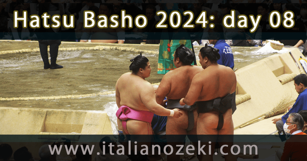Nakabi day all’hatsu basho, siamo arrivati al giro di boa, il giorno in cui i primi verdetti possono essere emessi e il giorno in cui ogni risultato aumenta in modo esponenziale il suo peso nel cammino verso il senshuraku. Ogni errore può diventare una zavorra clamorosa per il raggiungimento dei propri obbiettivi e ogni vittoria importante un boost per la chiusura del torneo. Anche oggi non sono mancate le sorprese per il pubblico del Ryogoku kokugikan ne un alto numero di match conclusi rapidamente con netta dominanza di uno dei due lottatori. Match of the day quello che ha visto protagonisti Midorifuji e Daieisho. Il sekiwake spinge alla sua maniera rapido e ad alto ritmo e forza l’avversario alla corda rapidamente, sembra fatta ma Midorifuji non ci sta e con grande agilità riesce a restare al di qua del tawara lasciando sorpreso anche Daieisho. Il M2 prova allora ad approfittare dell’istante di dubbio del sekiwake e propone il suo attacco che sbilancia il suo opponente, scambio di spinte e stavolta è Daieisho ad essere bravo alla corda, rapido di pensiero e pulito nell’esecuzione, sbilanciando Midorifuji e finendo l’opera spingendolo fuori dal dohyo.