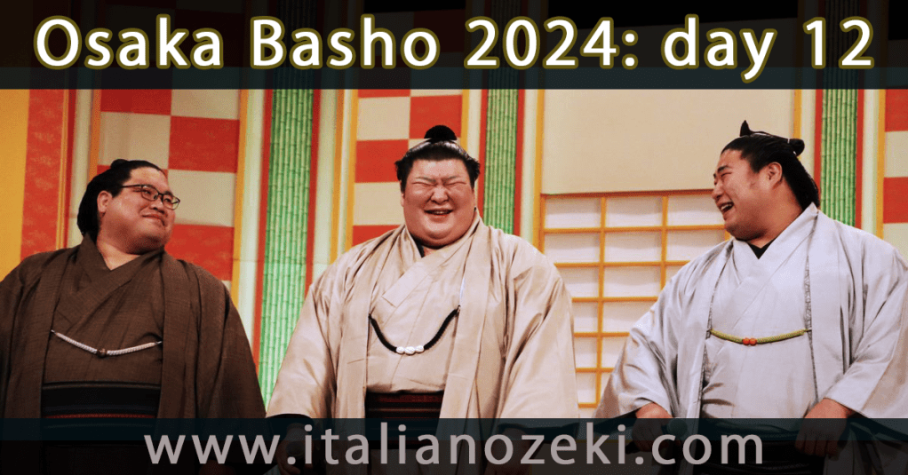 Abi trova il kachi koshi riuscendo a vincere la strenua difesa di Takayasu che dopo aver controlalto le braccia dell’avversario è costretto a cedere e ad arrendersi alla sua continuità di azione. Nishikigi difende con grande impegno e determinazione le offensive di Atamifuji che è bravo ad essere paziente e ad attendere il momento buono per l’affondo: blocco sul braccio, scivola di lato e piazza l’hatakikomi vincente. Buio pesto per il komusubi che nel prossimo banzuke farà una discesa libera verso il basso. Daieisho attacca… Daieisho cade vittima del suo attacco. Sembra un copione già scritto che si alterna a quello in cui il sekiwake invece riesce a spazzare via l’avversario di turno. Oggi è Gonoyama a sfruttare l’impeto della sua spinta per fare un passo indietro e mandarlo a terra per hatakikomi. Daieisho è ad un passo dal make koshi e rischia oltre che di perdere il rank di scivolare giù dal sanyaku se i numeri si facessero più gravi. Wakamotoharu attacca deciso con kachi age al tachi ai impattando bene su Takakeisho che non riesce a ribattere e, concedendo la presa sul mawashi consente al sekiwake di forzarlo rapidamente oltre la corda. Kadoban che ancora sta li con l’ottava vittoria che appare al momento quasi stregata, avrà la forza di trovare le necessarie energie l’ozeki per mantenere il suo rank? Grande impatto al tachi portato da entrambi con forza, Kotonowaka però è lesto a spostarsi lateralmente per non concedere il vantaggio della spinta immediata ad Onosato. Il maegashira parte col suo attacco ma cade nella trappola dell’ozeki che lo attendeva e va subito a cercare un blocco/leva sul braccio destro dellìavversario che sfrutta per accelerarne l’abbrivio forzandolo , di slancio, a terra.