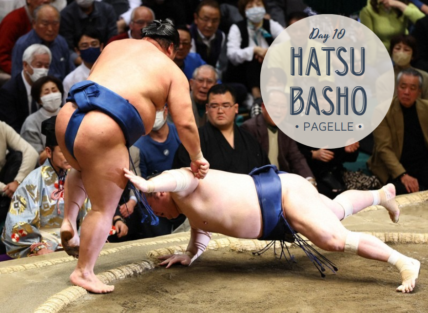 Decima giornata dell’hatsu basho, secondo giro di boa ultimato e inizia il conto alla rovescia degli ultimi cinque giorni di incontri che decreteranno il campione di questo torneo. La sconfitta di Kinbozan riapre, ovviamente, la corsa al titolo ma il kazako conserva comunque la testa della corsa in virtù della sconfitta di Chiyoshoma. Dietro il gruppetto degli inseguitori vince e cerca di riportarsi in posizioni più consone ai rispettivi rank. Giornata non troppo frizzante a livello di gesti tecnici particolari anche se non sono mancati diversi uwatenage/uwatedashunage/kotenage a rallegrare lo spirito del pubblico. Match del giorno offertoci dalle retrovie, con lo scontro prolungato, equilibrato e vivace fra Shonannoumi e Takarafuji. Il M8 chiude subito la distanza e prova a sorprendere l’avversario con una rapida spinta, Shonannoumi, però trova la presa con la sinistra e riesce a riportarsi al centro del dohyo e imporre qualche istante di stallo utile a riordinare le idee e riprendere fiato. Il M13 è il primo a rompere gli indugi e a spingere vicino alla corda l’avversario per poi subirne il ritorno e ritrovarsi coi piedi sul tawara. Takarafuji si gioca le ultime carte forzando la spinta su un opponente apparentemente solo da forzare fuori per qualche centimetro ma viene sorpreso dall’agile scatto di Shonannumi che si scansa sulla destra, trova la presa sul braccio e piazza il kotenage vincente.