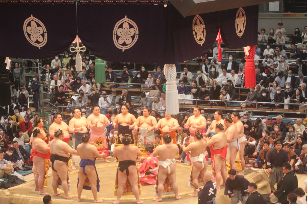 I lottatori sono divisi in due gruppi, est e ovest, i quali entrano sul dohyō partendo dal rikishi di livello più basso al più alto (fino allo Ozeki). Quando un lottatore sale sul dohyō viene proclamato al pubblico il suo nome, il luogo di provenienza e la palestra.