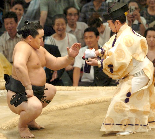 Terminato l’incontro il perdente si inchinerà a se ne andrà; il vincitore invece rimarrà, farà uno squat e un gesto con la mano. Soprattutto negli incontri di alto livello il gyōji darà una o più buste contenenti denaro ricevuto dagli sponsor al vincitore, il quale effettuerà un gesto con la mano chiamato 手刀 tegatana.