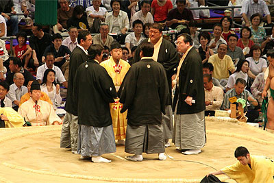 Durante i rituali il gyōji sarà di profilo rispetto al dohyō; quando il responsabile decreterà che il tempo è scaduto, il gyōji si metterà di fronte e i lottatori dovranno cominciare l’incontro.