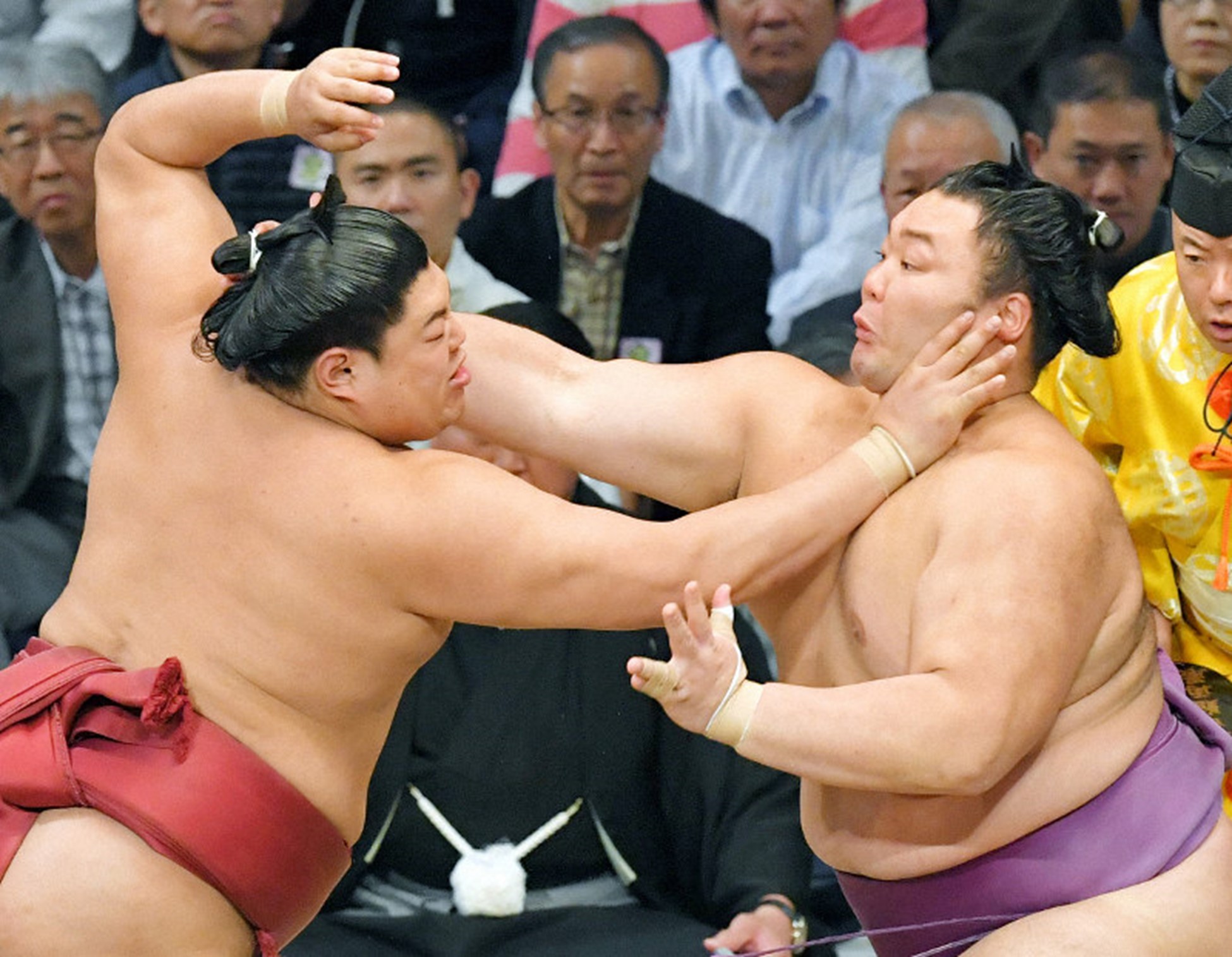 - nel caso in cui i due lottatori non riescano ad afferrare il mawashi può succedere che si affrontino appoggiando la propria testa a quella dell’avversario.
