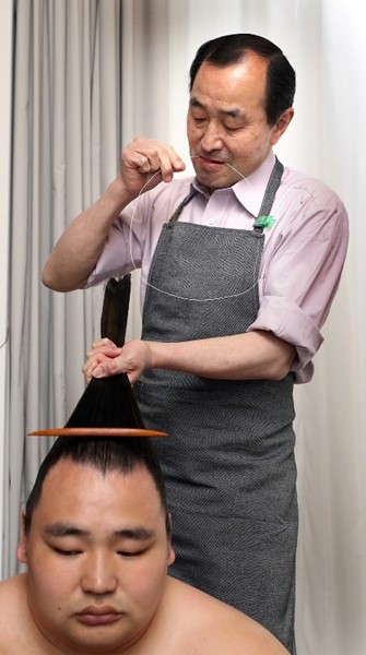 床鶴 Tokotsuru che acconcia lo Yokozuna 鶴竜 Kakuryū nel 2018 [fonte]